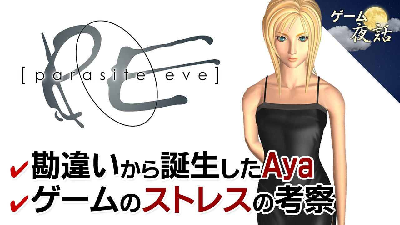 過去動画を宣伝して下さった皆さん、ありがとうございましたm(__)m<br>毎回ひとつのゲームを取り上げ、3つのテーマから解説&考察します。<br>【前編】は毎月1日・15日更新、【後編】は制作状況に応じて更新致します。<br><br><strong>【訂正と補足】<br>・Ayaが男を突き飛ばす場面は、よく見るとお尻ではなく、肩に見えますね(^^;<br>・画面左上ゲームロゴ「誤:parasaite」「正:parasite」<br>・動画内で「あるクリエイター」とお話している箇所がありますが、<br>それは「スマブラ」などで有名な桜井政博さんのことです。<br>ただ記憶が若干曖昧で、どの本に書かれている話か忘れてしまい、<br>情報ソースの確認をする時間がなかったので、<br>修正の利かない動画では、念のため名前を伏せさせて頂きました。<br><br>第87回「パラサイト・イヴ」</strong><br>■後編:<a href="https://www.nicovideo.jp/watch/sm37786077" class="watch">sm37786077</a><br><br>■youtubeはこちら <a href="https://youtu.be/HJ3Gv36h8x0" target="_blank" rel="noopener nofollow">https://youtu.be/HJ3Gv36h8x0</a><br>■告知用のツイッター <a href="https://twitter.com/gameyawa" target="_blank" rel="noopener nofollow">https://twitter.com/gameyawa</a><br><br>■第86回「バイオハザード4」前編:<a href="https://www.nicovideo.jp/watch/sm37684232" class="watch">sm37684232</a> 中編:<a href="https://www.nicovideo.jp/watch/sm37723302" class="watch">sm37723302</a> 後編:<a href="https://www.nicovideo.jp/watch/sm37727546" class="watch">sm37727546</a><br>■第88回「ポポロクロイス物語」前編:<a href="https://www.nicovideo.jp/watch/sm37824198" class="watch">sm37824198</a> 後編:<a href="https://www.nicovideo.jp/watch/sm37876633" class="watch">sm37876633</a><br><br>■ゲーム夜話マイリスト <a href="https://www.nicovideo.jp/mylist/56973971" target="_blank" rel="noopener">mylist/56973971</a><br><span style="color: #000000; font-size: 13px;">■ゲーム夜話特別編マイリスト <a href="https://www.nicovideo.jp/mylist/65104419" target="_blank" rel="noopener">mylist/65104419</a><br><br>■ゲームジャンル別マイリスト</span><br>・RPG <a href="https://www.nicovideo.jp/mylist/69852172" target="_blank" rel="noopener">mylist/69852172</a><br>・アクション <a href="https://www.nicovideo.jp/mylist/69852179" target="_blank" rel="noopener">mylist/69852179</a><br>・アクションRPG <a href="https://www.nicovideo.jp/mylist/69852177" target="_blank" rel="noopener">mylist/69852177</a><br>・アドベンチャー <a href="https://www.nicovideo.jp/mylist/69852182" target="_blank" rel="noopener">mylist/69852182</a><br>・アクションアドベンチャー <a href="https://www.nicovideo.jp/mylist/69852188" target="_blank" rel="noopener">mylist/69852188</a><br>・シミュレーション <a href="https://www.nicovideo.jp/mylist/69852189" target="_blank" rel="noopener">mylist/69852189</a><br>・ホラー <a href="https://www.nicovideo.jp/mylist/69852194" target="_blank" rel="noopener">mylist/69852194</a><br>・サウンドノベル <a href="https://www.nicovideo.jp/mylist/69852197" target="_blank" rel="noopener">mylist/69852197</a>