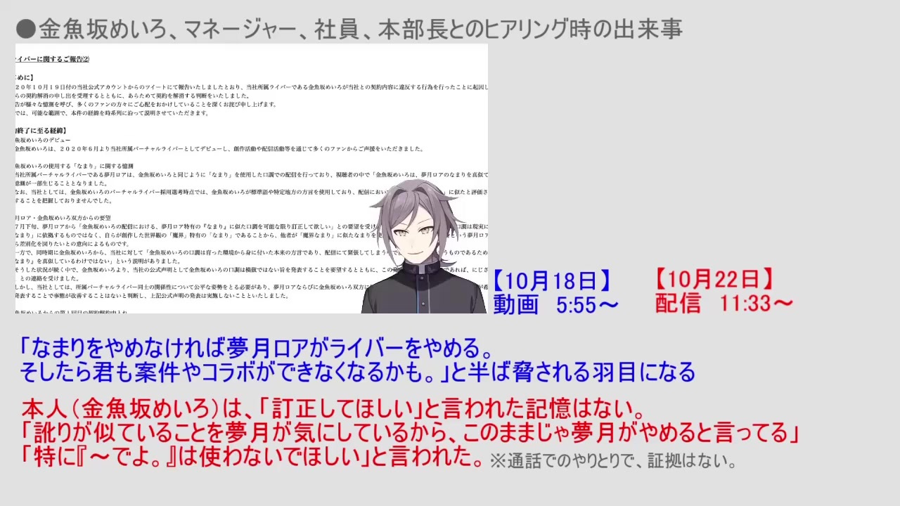 ●金魚坂めいろ騒動についての、鳴神裁の発言の変化を4つまとめました。<br><br>●参照動画<br>※<span style="color: #0000ff;">青字【10月18日】<br>パクリじゃなかった?にじさんじ運営と夢月ロアが金魚坂めいろを辞めさせた真実<br><a href="https://www.youtube.com/watch?v=mLwZ5uUx6QI&t=630s" target="_blank" rel="noopener nofollow">https://www.youtube.com/watch?v=mLwZ5uUx6QI&t=630s</a></span><br><br>※<span style="color: #6aa84f;">緑字【10月19日】<br>にじさんじ運営と夢月ロア、だんまり決め込む(後日談)<br><a href="https://www.youtube.com/watch?v=4rUOeFfKQkE&t=1s" target="_blank" rel="noopener nofollow">https://www.youtube.com/watch?v=4rUOeFfKQkE&t=1s</a></span><br><br>※<span style="color: #ff0000;">赤字【10月22日】<br>【LIVE】にじさんじから声明出た<br><a href="https://www.youtube.com/watch?v=zQiCcBBxhGk&t=1888s" target="_blank" rel="noopener nofollow">https://www.youtube.com/watch?v=zQiCcBBxhGk&t=1888s</a></span><br>