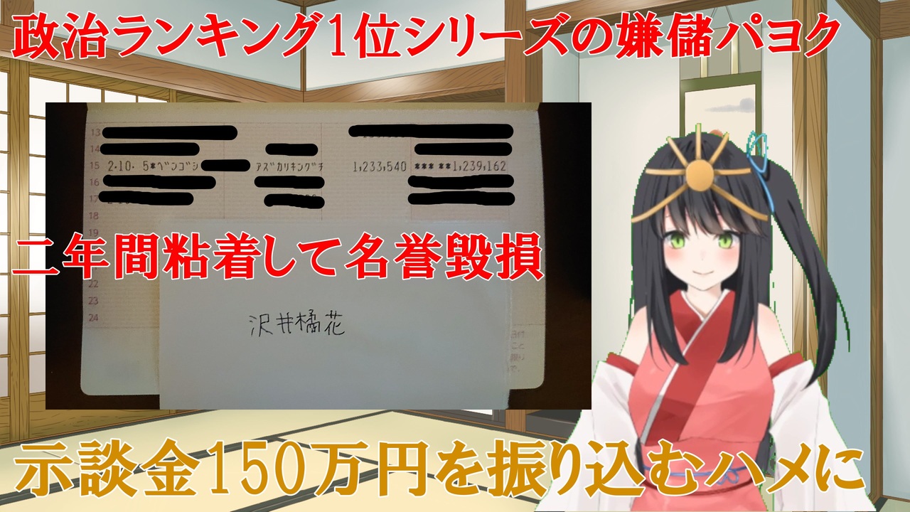 ついに二年間粘着してきて名誉毀損していた嫌儲パヨクが特定され、示談金150万円を振り込ませました。<br>やはり誹謗中傷や名誉毀損、晒しなどは政治思想に関係なくしてはいけません。<br>ちなみに私は弱者の味方である真の左翼、真のリベラルなので、モテなかったり貧乏で通り魔しそうな嫌儲民やパヨクの方がいたら一人で死ねなどと言わずに相談に乗ってあげます。<br>日本という国を恨んではいけません。<br>国は素晴らしい、でも親やいじめっ子、キリスト教や似非フェミはクソです。<br>日本ガーと主語を大きくせず、キリスト教や似非フェミなどの極右と極左だけを追い出し、日本を地上の楽園にしましょう。<br>大日本帝国万歳、エロ規制反対、ロリコン差別反対、一億総中流格差是正。<br>自民党は国家神道や統一教会や創価学会とつるんでエロを規制する、立憲民主党は反日売国奴、なら私に投票してください。<br>消去法で自民党の人は、まさしく私の登場を待ち望んでいたのではないでしょうか。<br>愛国とエロ、これを両立させ、最高の日本にすることを約束します。<br><br>YouTube↓<br><a href="https://www.youtube.com/watch?v=r2Lwhng4iBE" target="_blank" rel="noopener nofollow">https://www.youtube.com/watch?v=r2Lwhng4iBE</a><br><br>沢井橘花のTwitterに他のニコ動やYouTubeのアカウントへのリンクを固定ツイートしています。<br>ボカロ曲やネタ動画なども上げておりますので、時間がある時にでもぜひご覧ください。<br><br>Twitter(沢井橘花)<br><a href="https://twitter.com/BoCx5x32CMd81ve" target="_blank" rel="noopener nofollow">https://twitter.com/BoCx5x32CMd81ve</a>
