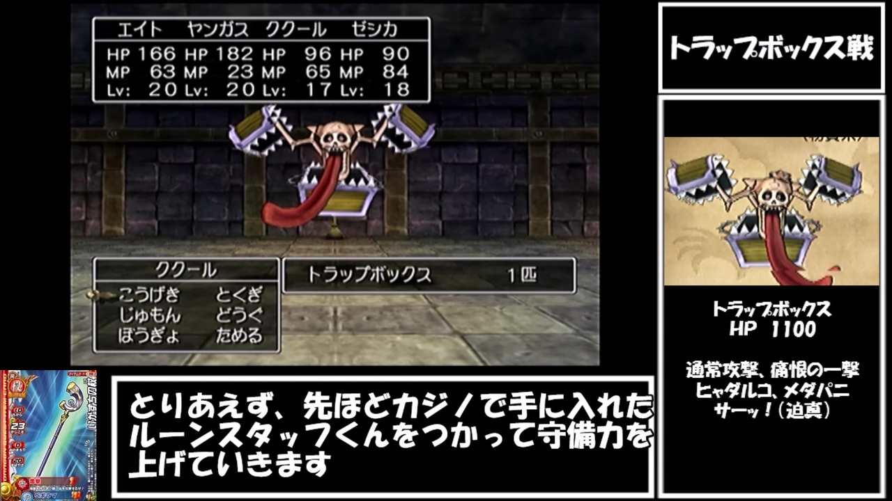 雑魚モンスターがきつくなってきたので初投稿です。<br><br>パルミド~トラップボックス戦まで<br><br><br><br><a href="https://www.nicovideo.jp/watch/sm37770717" class="watch">sm37770717</a>←前 <a href="https://www.nicovideo.jp/mylist/69843141" target="_blank" rel="noopener">mylist/69843141</a> 次→<a href="https://www.nicovideo.jp/watch/sm37796746" class="watch">sm37796746</a><br><br>生放送用を行うコミュ co4518186<br>Twitter:<a href="https://twitter.com/imomushidq8" target="_blank" rel="noopener nofollow">https://twitter.com/imomushidq8</a><br><br>【ルール】<br>①道具の使用のみで戦闘を行う。(ぼうぎょ・ためるは可能)<br>②移動中の呪文・特技の使用禁止。(すべて道具で行う)<br>③倒せないモンスターは、多少妥協する。<br>④なるべく失踪しない。<br><br>この動画で利用している株式会社スクウェア・エニックスを代表とする共同著作者が権利を所有する著作物及びスギヤマ工房有限会社が権利を所有する楽曲の転載・配布は禁止いたします。<br>© 2004 ARMOR PROJECT/BIRD STUDIO/LEVEL-5/SQUARE ENIX All Rights Reserved.<br>© SUGIYAMA KOBO<br><br>