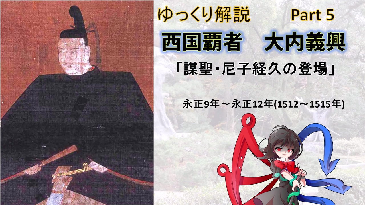 <span style="font-size: 16px;">大内義興、帰国できず</span><br><br>Part4 ⇒ <a href="https://www.nicovideo.jp/watch/sm37682249" class="watch">sm37682249</a> Part6 ⇒ <a href="https://www.nicovideo.jp/watch/sm37889915" class="watch">sm37889915</a><br><br>こんばんわ、三村家親・元親父子を調べたけど余りに備中の史料が無さ過ぎて困惑しているしかかくです。<br>本パートは前半は大内義興の幕府内の立ち位置について、後半は尼子経久と安芸国動乱について解説します。<br>今回は前半・後半通して状況解説が多めで戦はほぼ無いです。<br>船岡山合戦後、平穏に見えた義稙政権でしたが、崩壊の兆しは既に見えており・・・<br>また、論文を紹介していただいたk-holyさん、ありがとうございます。<br><br>追記<br>赤松家の洞松院ですが、通称は「まつ殿」ではなく「めし殿」です。表記ミスが多く申し訳ありません<br><br><br>YouTube; <a href="https://www.youtube.com/channel/UCRyZjTeQgxd8iXcL2P8vwNA" target="_blank" rel="noopener nofollow">https://www.youtube.com/channel/UCRyZjTeQgxd8iXcL2P8vwNA</a><br>Twitter; <a href="https://twitter.com/SquareDeerHorn" target="_blank" rel="noopener nofollow">https://twitter.com/SquareDeerHorn</a><br><br>参考文献<br>「萩藩閥閲録」「三浦文書」「益田家文書」「石見吉川家文書」「吉川家文書」「平賀文書」「小早川家文書」「天野毛利文書」「毛利家文書」「佐々木文書」「大内氏実録」「瓦林政頼記」「後法成寺尚通公記」「東寺過去帳」「拾芥記」「実隆公記」「不問物語」「蔭涼軒日録」「和長卿記」「後法成寺関白記」<br><br>藤井崇『大内義興 : 西国の「覇者」の誕生』<br>岸田裕之『毛利元就~武威天下無双、下民憐愍の文徳は未だ』<br>河村昭一『安芸武田氏』<br>福尾猛市郎『大内義隆』<br>山田康弘『足利義稙:戦国に生きた不屈の大将軍』<br>米原正義『出雲尼子一族』<br>河合正治『安芸毛利一族』<br>渡邊大門『赤松氏五代』<br>渡邊大門『戦国期赤松氏の研究』<br>浜口誠至『在京大名細川京兆家の政治史的研究』<br>今岡典和『足利義稙政権と大内義興』<br>山田貴司 「足利義材の流浪と西国の地域権力」<br>大内氏歴史文化研究会「大内氏の世界をさぐる」<br>今谷明「大内義興の山城国支配」<br>岸田裕之「大名領国の構成的展開」<br>川岡勉「尼子氏による出雲国成敗権掌握」<br>長谷川博史「戦国大名尼子氏権力の形成 - 出雲国奉公衆塩冶氏の掌握と討滅」<br>松浦義則「戦国大名の領主層掌握についてー出雲尼子氏を例として」<br>原慶三「応仁・文明の乱と尼子氏ー文書の声を聴くー」<br>今岡典和「戦国期の守護権カ - 出雲尼子氏を素材として」<br><br>