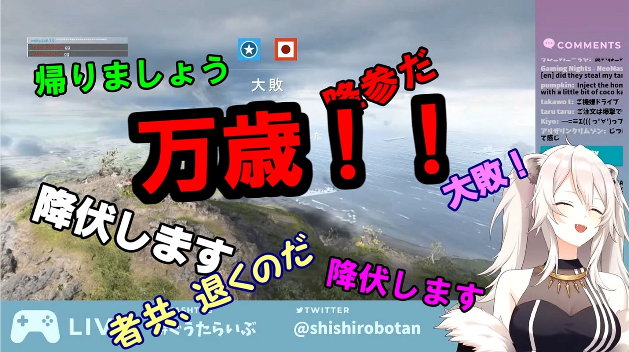 弾幕を動画内で手打ちするって労力の無駄使いをやってみました(*'▽')<br>日々のストレス発散に騒いじゃってください!!<br>万歳動画が好きだったんで皆さんもコメントどんどん上書きしてくれると嬉しいです!<br><br>こちらでも色々あげてます<br><a href="https://www.youtube.com/channel/UCcuf1tEQ4hRgUZllxWx2g7w/featured" target="_blank" rel="noopener nofollow">https://www.youtube.com/channel/UCcuf1tEQ4hRgUZllxWx2g7w/featured</a><br>元動画が削除されているので、ぼたんちゃんのチャンネルURL貼っときます<br>Botan Ch.獅白ぼたん<br><a href="https://www.youtube.com/channel/UCUKD-uaobj9jiqB-VXt71mA" target="_blank" rel="noopener nofollow">https://www.youtube.com/channel/UCUKD-uaobj9jiqB-VXt71mA</a><br><br>広告ありがとうございますm(__)m<br>syatikuさん、自転さん、神無月つくもさん、懲戒雷神さん、ちゃぁりさん、hikonyan1942さん、るーさん、ジュンイチさん、ボカロンさん、シュウさん、saluteさん、ラティ さん、<br>