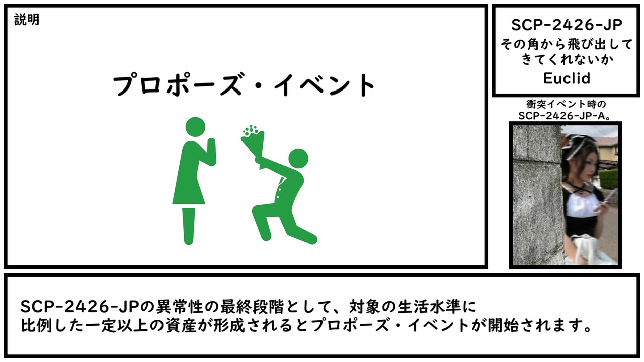 彼女は高嶺の花だったわけだ。<br><br><span style="color: rgba(0, 0, 0, 0.87); font-size: 15px;">本家記事 </span><a href="http://scp-jp.wikidot.com/scp-2426-jp" target="_blank" rel="noopener nofollow">http://scp-jp.wikidot.com/scp-2426-jp</a><br><span style="color: rgba(0, 0, 0, 0.87); font-size: 15px;">作者 </span>bamboon Hasuma_S highbriku<br><span style="color: rgba(0, 0, 0, 0.87); font-size: 15px;">SCP財団 <a href="http://scp-jp.wikidot.com" target="_blank" rel="noopener nofollow">http://scp-jp.wikidot.com</a></span><br><span style="color: #000000; font-size: 14px;">過去の動画はこちら </span><span style="color: #006699; font-size: 14px;"><a href="https://www.nicovideo.jp/mylist/67620202" target="_blank" rel="noopener">mylist/67620202</a></span><br><span style="color: rgba(0, 0, 0, 0.87); font-size: 15px;">CC-BY-SA 3.0</span>
