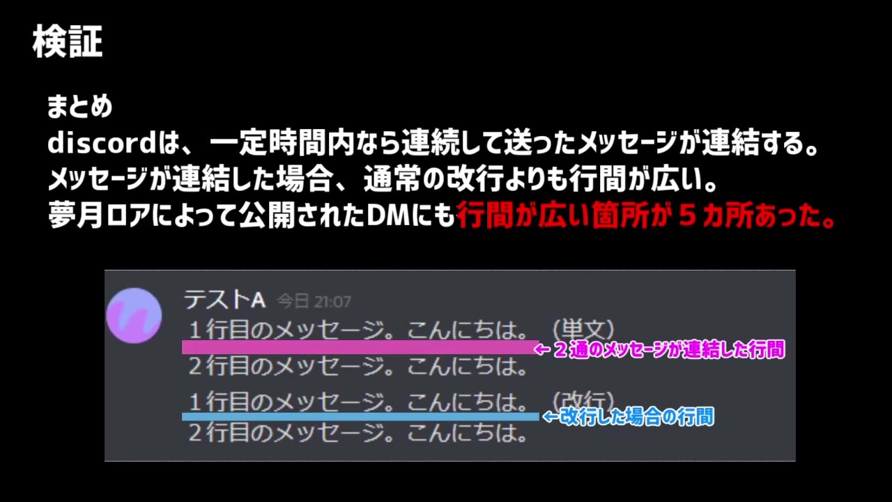 ●結論から言うと、合います。<br>●公式によるDMのメッセージ数(夢月ロア→9通 金魚坂めいろ→5通)と、公開されたDMの数があわない?という疑問を検証した動画です。<br><br>●discordを使ったことがある人はにとっては今さらですが、疑惑は一つでもつぶしておこうと思い、投稿しました。<br><br>●にじさんじ運営による経緯説明<br><a href="https://twitter.com/nijisanji_app/status/1318898278059053057?s=20" target="_blank" rel="noopener nofollow">https://twitter.com/nijisanji_app/status/1318898278059053057?s=20</a><br><br>●公開されたDM<br><a href="https://twitter.com/yuzuki_roa/status/1318912752413364224?s=20" target="_blank" rel="noopener nofollow">https://twitter.com/yuzuki_roa/status/1318912752413364224?s=20</a><br><br>●補足<br>10分以上間をあけて送信すると、メッセージが連結しないようです。<br>(実験では5分間隔→連結、10分→非連結 だったので、8分や9分でもくっつかない可能性もあります。そこまでは精密に調べていません。)<br><br><br><br><span style="color: #b7b7b7;">バーチャルコンビニオーナー三笠さんが11月12日の配信にて、私を名乗る人物からのマシュマロがあったとお話されていました。それは実際に私が送ったものです。(いくら名乗ろうと、私とは断定できませんよね、そりゃそうでした。匿名サービスとはそういうものだということを失念していました。反省です。)この場を借りてご報告させて頂きます。</span>