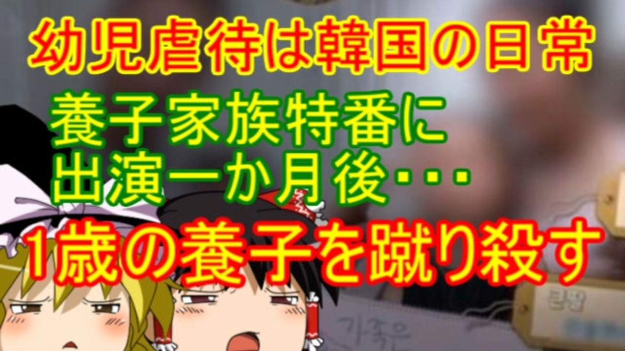 韓国で起きたサイコな幼児虐待事件をご紹介。<br>オバマゲート:<a href="https://www.nicovideo.jp/watch/sm37034701" class="watch">sm37034701</a><br>台湾の反浸透法:<a href="https://www.nicovideo.jp/watch/sm36237379" class="watch">sm36237379</a><br>愉快な朝鮮の歴史:<a href="https://www.nicovideo.jp/watch/sm36388468" class="watch">sm36388468</a><br>嫌韓スペシャル第二回:<a href="https://www.nicovideo.jp/watch/sm36040947" class="watch">sm36040947</a><br>嫌韓スペシャル第三回:<a href="https://www.nicovideo.jp/watch/sm36041024" class="watch">sm36041024</a><br><br>他のシリーズも宜しくね。<br><a href="https://www.nicovideo.jp/user/81752108/series" target="_blank" rel="noopener nofollow">https://www.nicovideo.jp/user/81752108/series</a><br>