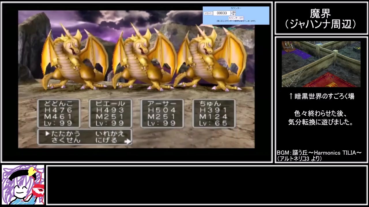 誰かさんのせいで編集に疲れて質問返しが出来ませんでした。<br><br><strong>※編集によりゲーム内のBGMとSEが無い場合があります。ご了承下さい。</strong><br><br><span style="color: rgba(0, 0, 0, 0.87); font-size: 15px;">【今回の内容】</span><br>魔界~暗黒世界のすごろく場<br><br><strong>本動画のプレイ(縛り)内容<br>1.モンスターボックスコンプリート<br>2.アイテムコンプリート(全種類のアイテムを所持する) ※一部不可能なアイテムは妥協<br>3.仲間モンスター全3匹勧誘<br>4.失踪しない</strong><br><br><a href="https://www.nicovideo.jp/watch/sm37781203" class="watch">sm37781203</a>←前 次→<a href="https://www.nicovideo.jp/watch/sm37847850" class="watch">sm37847850</a><br><br>本シリーズまとめ <a href="https://www.nicovideo.jp/mylist/70287027" target="_blank" rel="noopener">mylist/70287027</a><br><br>※一部汚い音声があるので苦手な人はブラバしましょう。<br><br><span style="color: #000000; font-size: 14px;">Youtube版→</span><a href="https://youtu.be/iNQtop6pZwo" target="_blank" rel="noopener nofollow">https://youtu.be/iNQtop6pZwo</a><br><br>©2004 ARMOR PROJECT/BIRD STUDIO/ARTEPIAZZA/SQUARE ENIX All Rights Reserved.<br>©KOICHI SUGIYAMA