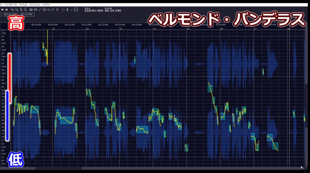 前回(<a href="https://www.nicovideo.jp/watch/sm37809630" class="watch">sm37809630</a>)のコメントにあった物+αを調べてみました。<br>左側の赤と青のラインがそれぞれ女性、男性の平均的な喋り声の周波数ですが、<br>声を張る仕事ゆえか女性領域に食い込む男性ライバーがかなり多いです。<br>また、ベルモンドさんは声質がとにかく太いため実際より低く聞こえるようで、<br>キーとしては実は低くないので雰囲気の物真似はしやすいみたいです。<br><br>ちなみに、アンジュの3:16「そうっすねあの」の部分はエッジボイスでD2が出ていますが、<br>女性の出せる最低音としてギネスに記録されている音が恐らくチェストボイスのD2です。<br><br>▼使用したアーカイブ▼<br><br>▼ベルさんの物真似してる葛葉と本物<br>[live]【MHW】モンスターハンター:ワールド Vtuber腕相撲大会『#V腕相撲』<br><a href="https://www.youtube.com/watch?v=5SJ98Fx39NY" target="_blank" rel="noopener nofollow">https://www.youtube.com/watch?v=5SJ98Fx39NY</a><br><br>▼本物のベルさん<br>【#ベルモンド誕生日】はじめての凸待ち!これからもよろしく!【ベルモンド・バンデラス/にじさんじ】<br><a href="https://www.youtube.com/watch?v=Nml03l0uczo" target="_blank" rel="noopener nofollow">https://www.youtube.com/watch?v=Nml03l0uczo</a><br><br>▼葛葉と卯月<br>【 雑 】ヨウアーキン【 #Zatsu 】<br><a href="https://www.youtube.com/watch?v=Yva28FzjLhA" target="_blank" rel="noopener nofollow">https://www.youtube.com/watch?v=Yva28FzjLhA</a><br><br>▼エクス<br>【雑談】いろいろ話してなかったこと全部話す奴【にじさんじ /エクス・アルビオ】<br><a href="https://www.youtube.com/watch?v=VXbNojYcxQk" target="_blank" rel="noopener nofollow">https://www.youtube.com/watch?v=VXbNojYcxQk</a><br><br>▼寝起きアンジュ<br>【□のんびり雑談】おはようございます!【アンジュ・カトリーナ/にじさんじ】<br><a href="https://www.youtube.com/watch?v=kgzn4YAdIN4" target="_blank" rel="noopener nofollow">https://www.youtube.com/watch?v=kgzn4YAdIN4</a><br><br><br><br>おまけ・うるさい叶くん(<a href="https://www.nicovideo.jp/watch/sm37484175" class="watch">sm37484175</a>)<br><br>引用させて頂きました。