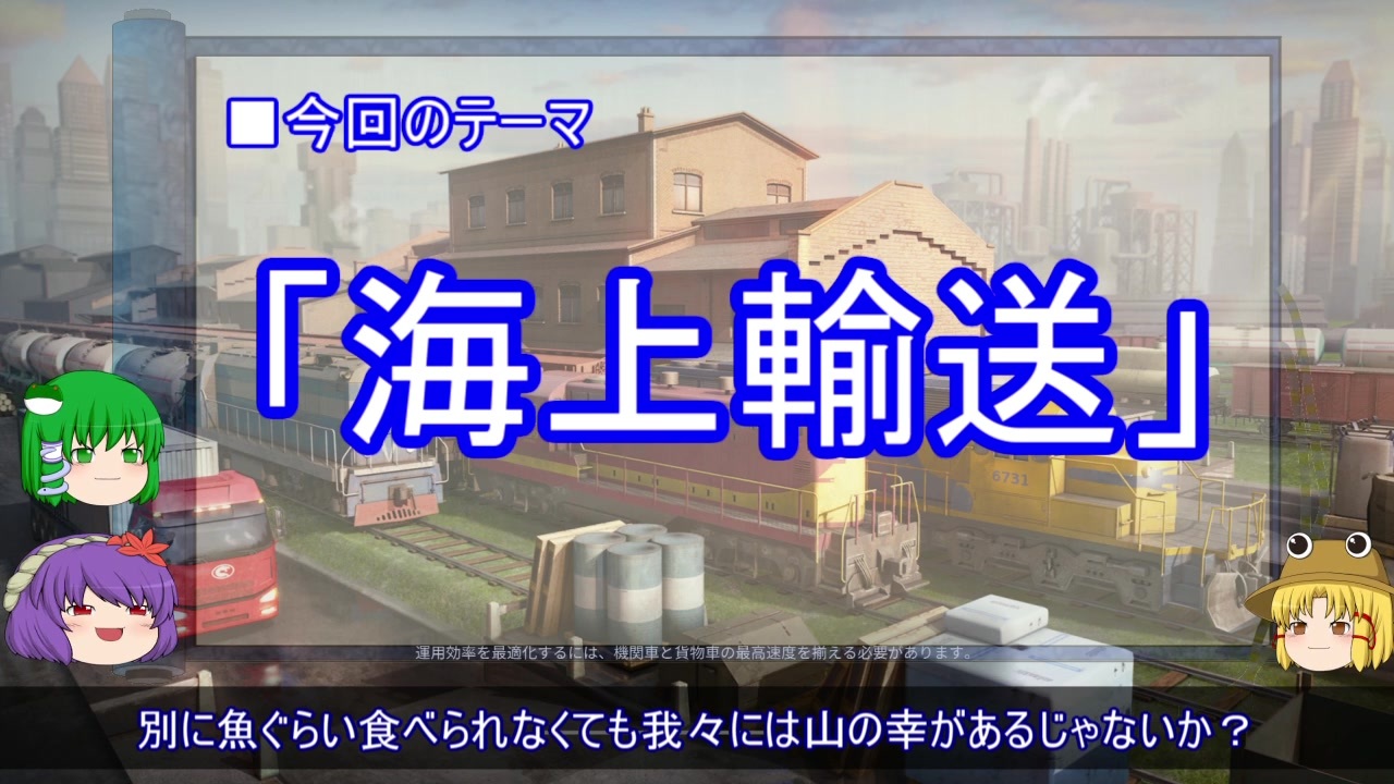 今回は「海上輸送」と「海」のありがたさについて。<br>この動画のアップ作業中の事ですが、うぷ主大学時代の所属ゼミのテーマが「覇権国家」だったのを思い出しました(遠い記憶)。<br><br>次回:海軍に関する一考察(日本史と海篇)<br><a href="https://www.nicovideo.jp/watch/sm37875141" class="watch">sm37875141</a><br><br>前回:海軍に関する一考察(南北逆に見た日本篇)<br><a href="https://www.nicovideo.jp/watch/sm37804591" class="watch">sm37804591</a><br><br>BGM:COOL&CREATE 最終鬼畜妹フランドール・S<br><a href="http://cool-create.cc/" target="_blank" rel="noopener nofollow">http://cool-create.cc/</a><br><br>背景:Urban Games「Transport Fever 2」<br><br>動画作成ツール:ゆっくりムービーメーカー3<br><a href="https://manjubox.net/ymm3/" target="_blank" rel="noopener nofollow">https://manjubox.net/ymm3/</a><br><br>立ち絵:キャラ素材(きつねゆっくり) - Nicotalk &キャラ素材配布所<br><a href="http://www.nicotalk.com/charasozai_kt.html" target="_blank" rel="noopener nofollow">http://www.nicotalk.com/charasozai_kt.html</a><br><br>AquesTalkライセンス購入済み