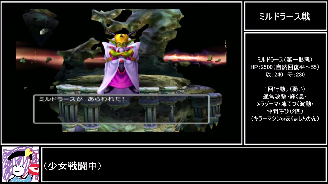 後半部分の説明が若干雑になってしまいました。<br>もし分かりにくい場合はスルーして頂いて構いません。<br><br>ミルドラースを絶対に許すな。<br><br><strong>※編集によりゲーム内のBGMとSEが無い場合があります。ご了承下さい。</strong><br><br><span style="color: rgba(0, 0, 0, 0.87); font-size: 15px;">【今回の内容】</span><br>エビルマウンテン~エンディング<br><br><strong>本動画のプレイ(縛り)内容<br>1.モンスターボックスコンプリート<br>2.アイテムコンプリート(全種類のアイテムを所持する) ※一部不可能なアイテムは妥協<br>3.仲間モンスター全3匹勧誘<br>4.失踪しない</strong><br><br><a href="https://www.nicovideo.jp/watch/sm37815038" class="watch">sm37815038</a>←前 次→<a href="https://www.nicovideo.jp/watch/sm37884979" class="watch">sm37884979</a><br><br>本シリーズまとめ <a href="https://www.nicovideo.jp/mylist/70287027" target="_blank" rel="noopener">mylist/70287027</a><br><br>※一部汚い音声があるので苦手な人はブラバしましょう。<br><br><span style="color: #000000; font-size: 14px;">Youtube版→</span><a href="https://youtu.be/qNlYNf-1F_Q" target="_blank" rel="noopener nofollow">https://youtu.be/qNlYNf-1F_Q</a><br><br>©2004 ARMOR PROJECT/BIRD STUDIO/ARTEPIAZZA/SQUARE ENIX All Rights Reserved.<br>©KOICHI SUGIYAMA