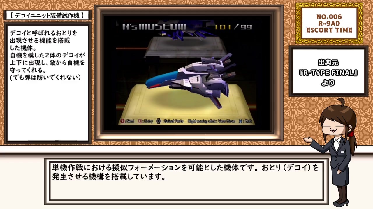 ご来館ありがとうございます。<br>こちらではR-TYPE FINALの全101機を個別に解説していきます。<br><br><span style="color: #ff0000;"><strong>※R戦闘機101機フェルト化計画とR-TYPE学会で解説した内容と重複する場合がありますが<br>予めご了承ください。</strong></span><br><br><br>No.005【<a href="https://www.nicovideo.jp/watch/sm37694470" class="watch">sm37694470</a>】 ← 【<a href="https://www.nicovideo.jp/mylist/69485195" target="_blank" rel="noopener">mylist/69485195</a>】 → No.007【<a href="https://www.nicovideo.jp/watch/sm37898519" class="watch">sm37898519</a>】<br><span style="color: #ff9900;"><strong>ぜひこちらも併せてお楽しみください</strong></span><br><strong>R戦闘機101機フェルト化計画 6機目→【</strong><a href="https://www.nicovideo.jp/watch/sm27645591" class="watch">sm27645591</a><strong>】</strong><br><br><br>R's museum年間パスポートはこちら→【<a href="https://seiga.nicovideo.jp/seiga/im10602469" target="_blank" rel="noopener">im10602469</a>】<br><br><span style="color: #9900ff;"><strong>グランゼーラMusic→<a href="https://granzellamusic.jp/" target="_blank" rel="noopener nofollow">https://granzellamusic.jp/</a></strong></span><br><br><span style="color: #ff9900;"><strong>ぐらんぜーら購買部→<a href="https://granzellastore.jp/ic/cat-004" target="_blank" rel="noopener nofollow">https://granzellastore.jp/ic/cat-004</a></strong></span><br><br><span style="color: #3c78d8;"><strong>R-TYPE FINAL2の最新トレーラー映像→<a href="https://www.youtube.com/channel/UC1q71eseep6XSYDpKueFpWA" target="_blank" rel="noopener nofollow">https://www.youtube.com/channel/UC1q71eseep6XSYDpKueFpWA</a></strong></span><br><br><br>R戦闘機101機フェルト化計画→【<a href="https://www.nicovideo.jp/mylist/50480079" target="_blank" rel="noopener">mylist/50480079</a>】<br>R-TYPE学会→【<a href="https://www.nicovideo.jp/mylist/62392399" target="_blank" rel="noopener">mylist/62392399</a>】<br>R-TYPEの二次創作手描きアニメ→【<a href="https://www.nicovideo.jp/mylist/59277561" target="_blank" rel="noopener">mylist/59277561</a>】<br>その他STG手芸作品→【<a href="https://www.nicovideo.jp/mylist/54154674" target="_blank" rel="noopener">mylist/54154674</a>】<br><br>BOOTH(STG漫画)→<a href="https://teamftype.booth.pm/" target="_blank" rel="noopener nofollow">https://teamftype.booth.pm/</a><br>twitter→<a href="https://twitter.com/handmadesiyouzu" target="_blank" rel="noopener nofollow">https://twitter.com/handmadesiyouzu</a><br>ブログ→<a href="http://blog.goo.ne.jp/suga1324" target="_blank" rel="noopener nofollow">http://blog.goo.ne.jp/suga1324</a>