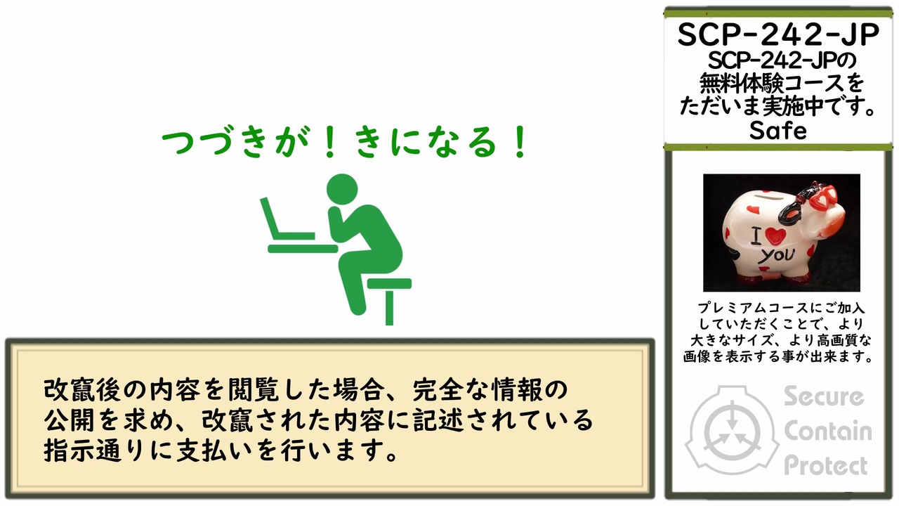タダより高い物はないってマ?<br><br>【訂正】8:00 読みが1000(せん)となっていますが、正しくは字幕の方であり10000(いちまん)でした。お詫びして訂正します。<br><br>Author: darumaboy<br>Title: SCP-242-JPの無料体験コースをただいま実施中です。<br>Source: <a href="http://scp-jp.wikidot.com/scp-242-jp" target="_blank" rel="noopener nofollow">http://scp-jp.wikidot.com/scp-242-jp</a><br>CC BY-SA 3.0<br><br>【追記】広告ありがとうございます!<br><br>テラヤマ さん<br>にけい さん<br>左上哀歌 さん<br>はにばる さん<br>そらと さん<br>ミスト さん<br>はずれ さん<br>funayama さん<br>箏一 さん<br>キャノン さん<br>okeazarashi さん<br><br /><br>どうも。シイナミです!<br>シャロ推しでいろんなこと(SCP,ごちうさ,みんはや,バンドリ,麻雀,ようつべ,ニコニコ,動画編集,野球etc)大好き!普段ツイッターにいるかも。毎日これを(おはツイ,みんはやごちうさクイズ,ミラティブバンドリ配信,つべで動画作り生配信)しています。<br><br>◆YouTube<br>SCP→<a href="https://www.youtube.com/c/shiinami_SCP" target="_blank" rel="noopener nofollow">https://www.youtube.com/c/shiinami_SCP</a><br>生配信系→<a href="https://www.youtube.com/c/shiinamiLive" target="_blank" rel="noopener nofollow">https://www.youtube.com/c/shiinamiLive</a><br>◆ニコニコ動画<br><a href="https://www.nicovideo.jp/user/96748543" target="_blank" rel="noopener nofollow">https://www.nicovideo.jp/user/96748543</a><br>◆Twitter<br>メイン→<a href="https://twitter.com/shiinami_" target="_blank" rel="noopener nofollow">https://twitter.com/shiinami_</a><br>動画用→<a href="https://twitter.com/shiinami_movie" target="_blank" rel="noopener nofollow">https://twitter.com/shiinami_movie</a><br>◆Instagram<br><a href="https://www.instagram.com/shiinami_/" target="_blank" rel="noopener nofollow">https://www.instagram.com/shiinami_/</a> <br>◆LINEオフィシャル<br><a href="http://nav.cx/2I9Oyqn" target="_blank" rel="noopener nofollow">http://nav.cx/2I9Oyqn</a><br>◆ミラティブ<br><a href="http://mirrativ.com/user/100956628" target="_blank" rel="noopener nofollow">http://mirrativ.com/user/100956628</a><br><br>いいね!・フォローのほど、よろしくお願いします。
