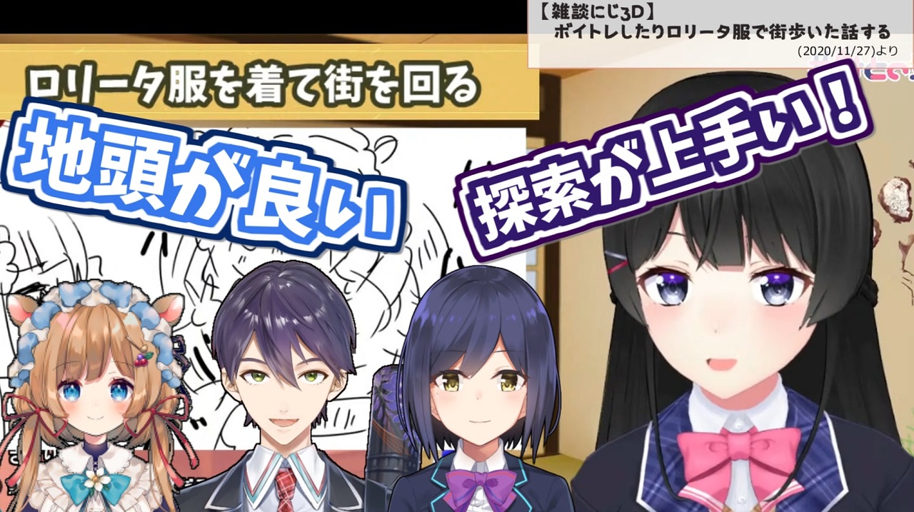 脱出ゲームしてるとこ見てみたいですね<br>月ノ美兎<br><a href="https://www.youtube.com/channel/UCD-miitqNY3nyukJ4Fnf4_A?sub_confirmation=1" target="_blank" rel="noopener nofollow">https://www.youtube.com/channel/UCD-miitqNY3nyukJ4Fnf4_A?sub_confirmation=1</a><br>エリー・コニファー<br><a href="https://www.youtube.com/channel/UCpNH2Zk2gw3JBjWAKSyZcQQ?sub_confirmation=1" target="_blank" rel="noopener nofollow">https://www.youtube.com/channel/UCpNH2Zk2gw3JBjWAKSyZcQQ?sub_confirmation=1</a><br>静凛<br><a href="https://www.youtube.com/channel/UC6oDys1BGgBsIC3WhG1BovQ?sub_confirmation=1" target="_blank" rel="noopener nofollow">https://www.youtube.com/channel/UC6oDys1BGgBsIC3WhG1BovQ?sub_confirmation=1</a><br>剣持刀也<br><a href="https://www.youtube.com/channel/UCv1fFr156jc65EMiLbaLImw?sub_confirmation=1" target="_blank" rel="noopener nofollow">https://www.youtube.com/channel/UCv1fFr156jc65EMiLbaLImw?sub_confirmation=1</a><br><br><br>▼元動画<br>【雑談にじ3D】ボイトレしたりロリータ服で街歩いた話する【にじさんじ/月ノ美兎】(2020/11/27)<br><a href="https://www.youtube.com/watch?v=iEGbzDtuHkA" target="_blank" rel="noopener nofollow">https://www.youtube.com/watch?v=iEGbzDtuHkA</a><br>・該当箇所(1:08:31~)<br><a href="https://www.youtube.com/watch?v=iEGbzDtuHkA&feature=youtu.be&t=4111" target="_blank" rel="noopener nofollow">https://www.youtube.com/watch?v=iEGbzDtuHkA&feature=youtu.be&t=4111</a><br><br>▼前回のほんまのくずや<br>【3D】地獄のすごろく。 必ず従え(2020/11/14)<br><a href="https://www.youtube.com/watch?v=NMgYGxF5fC0" target="_blank" rel="noopener nofollow">https://www.youtube.com/watch?v=NMgYGxF5fC0</a>