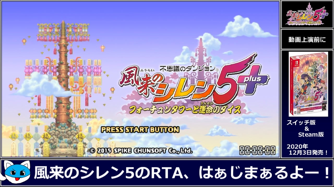 (シレン5のRTA動画は)初投稿です。<br>この動画をきっかけに、多くの方がシレン5に興味を持ってくれると嬉しいです!<br>なんと、2020/12/03にスイッチ/Steamで発売ですって!(約3000円)<br><br>追記…たくさんの広告ありがとうございます(全力土下座)<br><br>パート2→<a href="https://www.nicovideo.jp/watch/sm37900881" class="watch">sm37900881</a><br>パート3→<a href="https://www.nicovideo.jp/watch/sm37901003" class="watch">sm37901003</a><br>本作シリーズ→<a href="https://www.nicovideo.jp/series/183359" target="_blank" rel="noopener">series/183359</a><br>Part.1集→<a href="https://www.nicovideo.jp/mylist/53326054" target="_blank" rel="noopener">mylist/53326054</a><br><br>・シレン5の基本システム紹介(生声)<br><a href="https://www.nicovideo.jp/watch/sm37877568" class="watch">sm37877568</a><br>---------------------------------------------------------------------<br>【タイトル】不思議のダンジョン 風来のシレン5 plus フォーチュンタワーと運命のダイス<br>【対応機種】PlayStation®Vita / Nintendo Switch / PC(Steam)<br>【発売日】2015年6月4日 / 2020年12月3日<br>【価格】Vita4,752円 (税込) / NSパケ版3,980円+税)、DL版2,709円+税<br>【公式サイト】<a href="http://www.spike-chunsoft.co.jp/shiren5plus/" target="_blank" rel="noopener nofollow">http://www.spike-chunsoft.co.jp/shiren5plus/</a><br>【Steamページ】<a href="https://store.steampowered.com/app/1178790/_5plus/" target="_blank" rel="noopener nofollow">https://store.steampowered.com/app/1178790/_5plus/</a><br>---------------------------------------------------------------------<br>【Twitter】<a href="https://twitter.com/ononon0905" target="_blank" rel="noopener nofollow">https://twitter.com/ononon0905</a><br>【niconico】<a href="https://www.nicovideo.jp/user/766253/video" target="_blank" rel="noopener nofollow">https://www.nicovideo.jp/user/766253/video</a><br>【ブログ】<a href="https://ch.nicovideo.jp/shiren" target="_blank" rel="noopener nofollow">https://ch.nicovideo.jp/shiren</a><br>【YouTube】<a href="https://www.youtube.com/user/ononon0905/featured" target="_blank" rel="noopener nofollow">https://www.youtube.com/user/ononon0905/featured</a><br>---------------------------------------------------------------------