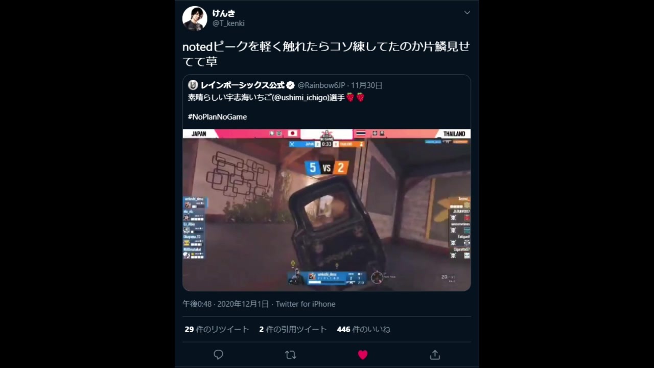 元動画<br><a href="https://www.youtube.com/watch?v=0cPHg9G_iDE&feature=youtu.be" target="_blank" rel="noopener nofollow">https://www.youtube.com/watch?v=0cPHg9G_iDE&feature=youtu.be</a><br>引用ツイート<br><a href="https://twitter.com/T_kenki/status/1333619036085633025" target="_blank" rel="noopener nofollow">https://twitter.com/T_kenki/status/1333619036085633025</a><br><br>各チャンネル(※敬称略)<br>宇志海いちご<br><a href="https://www.youtube.com/channel/UCmUjjW5zF1MMOhYUwwwQv9Q" target="_blank" rel="noopener nofollow">https://www.youtube.com/channel/UCmUjjW5zF1MMOhYUwwwQv9Q</a><br>魔使マオ<br><a href="https://www.youtube.com/channel/UCerkculBD7YLc_vOGrF7tKg" target="_blank" rel="noopener nofollow">https://www.youtube.com/channel/UCerkculBD7YLc_vOGrF7tKg</a><br>けんき<br><a href="https://www.youtube.com/channel/UCNicQVuAQJYlCQKEw1TKn1A" target="_blank" rel="noopener nofollow">https://www.youtube.com/channel/UCNicQVuAQJYlCQKEw1TKn1A</a><br>きんち<br><a href="https://www.youtube.com/channel/UCLjXFtPkrdjwpuwdlqBtsHQ" target="_blank" rel="noopener nofollow">https://www.youtube.com/channel/UCLjXFtPkrdjwpuwdlqBtsHQ</a><br><br>アジア対抗ルーキー大会「NO PLAN NO GAME」<br>準決勝 VSタイ<br><a href="https://www.youtube.com/watch?v=Ie7xD7qTUmA&t=2788s" target="_blank" rel="noopener nofollow">https://www.youtube.com/watch?v=Ie7xD7qTUmA&t=2788s</a><br>決勝 VS韓国<br><a href="https://www.youtube.com/watch?v=l8gIfzBJIOI" target="_blank" rel="noopener nofollow">https://www.youtube.com/watch?v=l8gIfzBJIOI</a>