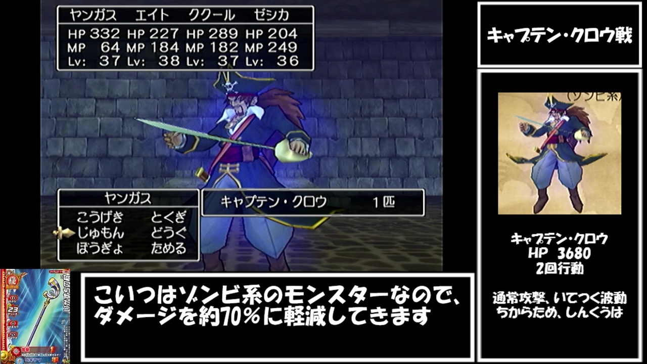 てんばつの杖のノルマを達成したので初投稿です。<br><br>海賊の洞窟~キャプテン・クロウ戦まで<br><br><a href="https://www.nicovideo.jp/watch/sm37870355" class="watch">sm37870355</a>←前 <a href="https://www.nicovideo.jp/mylist/69843141" target="_blank" rel="noopener">mylist/69843141</a> 次→<a href="https://www.nicovideo.jp/watch/sm37931026" class="watch">sm37931026</a><br><br>生放送用を行うコミュ co4518186<br>Twitter:<a href="https://twitter.com/imomushidq8" target="_blank" rel="noopener nofollow">https://twitter.com/imomushidq8</a><br><br>【ルール】<br>①道具の使用のみで戦闘を行う。(ぼうぎょ・ためるは可能)<br>②移動中の呪文・特技の使用禁止。(すべて道具で行う)<br>③倒せないモンスターは、多少妥協する。<br>④なるべく失踪しない。<br><br>この動画で利用している株式会社スクウェア・エニックスを代表とする共同著作者が権利を所有する著作物及びスギヤマ工房有限会社が権利を所有する楽曲の転載・配布は禁止いたします。<br>© 2004 ARMOR PROJECT/BIRD STUDIO/LEVEL-5/SQUARE ENIX All Rights Reserved.<br>© SUGIYAMA KOBO<br>