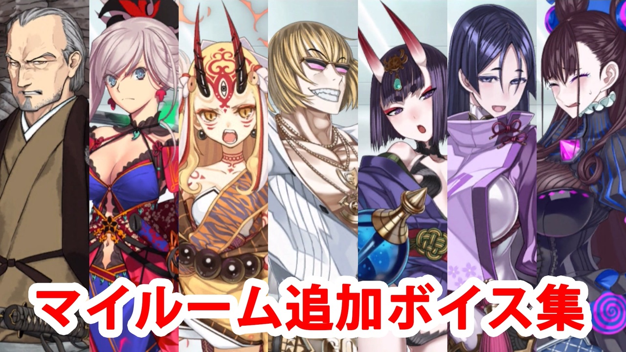 第2部 第5.5章「地獄界曼荼羅 平安京 轟雷一閃」実装に合わせて追加されたマイルームボイスのまとめです。<br>一部のボイスは蘆屋道満と渡辺綱のボイス集に収録したものと重複しています。<br><br>【対象サーヴァント】<br>・坂田金時(CV:遊佐浩二)<br>・酒呑童子(CV:悠木碧)<br>・茨木童子、茨木童子〔ランサー〕(水着)(CV:東山奈央)<br>・源頼光(CV:戸松遥)<br>・宮本武蔵(CV:佐倉綾音)<br>・柳生但馬守宗矩(CV:山路和弘)<br>・紫式部、紫式部〔ライダー〕(水着)(CV:茅野愛衣)<br><br>YouTube版はこちら<br><a href="https://www.youtube.com/watch?v=T1y196Sz8YE" target="_blank" rel="noopener nofollow">https://www.youtube.com/watch?v=T1y196Sz8YE</a><br><a href="https://www.youtube.com/watch?v=ei1Lve5Shjc" target="_blank" rel="noopener nofollow">https://www.youtube.com/watch?v=ei1Lve5Shjc</a><br><br>投稿済ボイス集→<a href="https://www.nicovideo.jp/mylist/57873980" target="_blank" rel="noopener">mylist/57873980</a>、<a href="https://www.nicovideo.jp/mylist/68037946" target="_blank" rel="noopener">mylist/68037946</a><br>