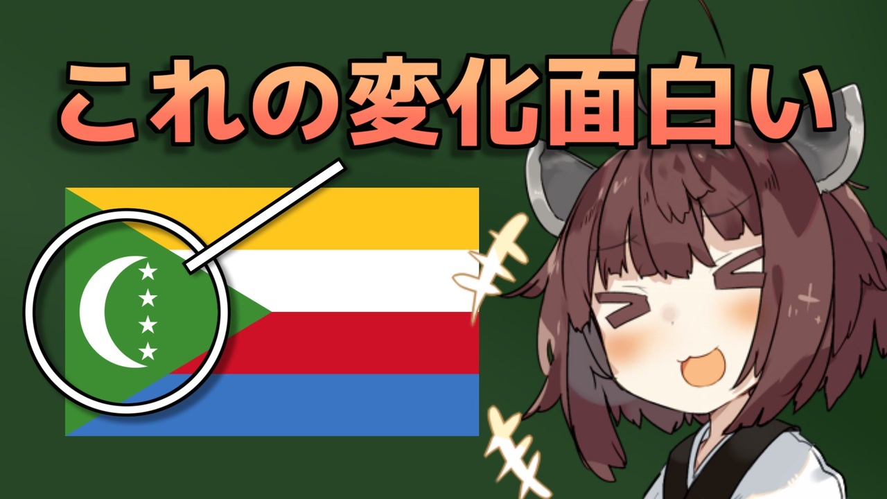 ”コモロ国旗”で変換すると、最初”小諸国旗”で誤変換される説<br><br>12/9 風邪引いたみたいなのでちょっと投稿お休みします…<br>12/12 風邪治りました!再開予定日は12/16です。<br><br>【前回】<a href="https://www.nicovideo.jp/watch/sm37923285" class="watch">sm37923285</a>【次回】<a href="https://www.nicovideo.jp/watch/sm37971173" class="watch">sm37971173</a><br><br>過去動画:三日月と星とイスラム教<br>→ <a href="https://www.nicovideo.jp/watch/sm37910392" class="watch">sm37910392</a><br><br>◎きりたんの国旗解説リスト<br>→ <a href="https://www.nicovideo.jp/mylist/69668308" target="_blank" rel="noopener">mylist/69668308</a><br><br>★今回触れた国旗の詳しい解説<br>→ <a href="https://flaghistory.jp/comoros/" target="_blank" rel="noopener nofollow">https://flaghistory.jp/comoros/</a><br><br>★国旗解説サイトよかったら見てね!<br>→ <a href="https://flaghistory.jp/" target="_blank" rel="noopener nofollow">https://flaghistory.jp/</a><br><br>【今回の参考書籍】<br>●苅安望『世界の国旗・国章 歴史大図鑑』山川出版社, 2017.<br>●シャスタインターナショナル『新版 世界の国旗~国旗で知る世界の国々~』シャスタインターナショナル, 2019.<br>●その他ウェブサイトなど<br><br>#画像引用元<br>○<a href="https://commons.wikimedia.org/wiki/File:Flag_of_the_Comoros_(1975%E2%80%931978).svg" target="_blank" rel="noopener nofollow">https://commons.wikimedia.org/wiki/File:Flag_of_the_Comoros_(1975%E2%80%931978).svg</a><br>○<a href="https://www.fotw.info/flags/km%7D.html" target="_blank" rel="noopener nofollow">https://www.fotw.info/flags/km%7D.html</a><br /><br><span style="color: #262626;"><strong>【</strong></span><span style="color: #6aa84f;"><strong>本出しました</strong></span><span style="color: #262626;"><strong>】</strong></span><br>面白く書けたと思うので、よかったら読んでみてね!<br>○この国旗トリビアは知らないでしょ?<br>→ <a href="https://amzn.to/3ffgBxT" target="_blank" rel="noopener nofollow">https://amzn.to/3ffgBxT</a><br><br>※電子書籍版の同人誌みたいなものです。