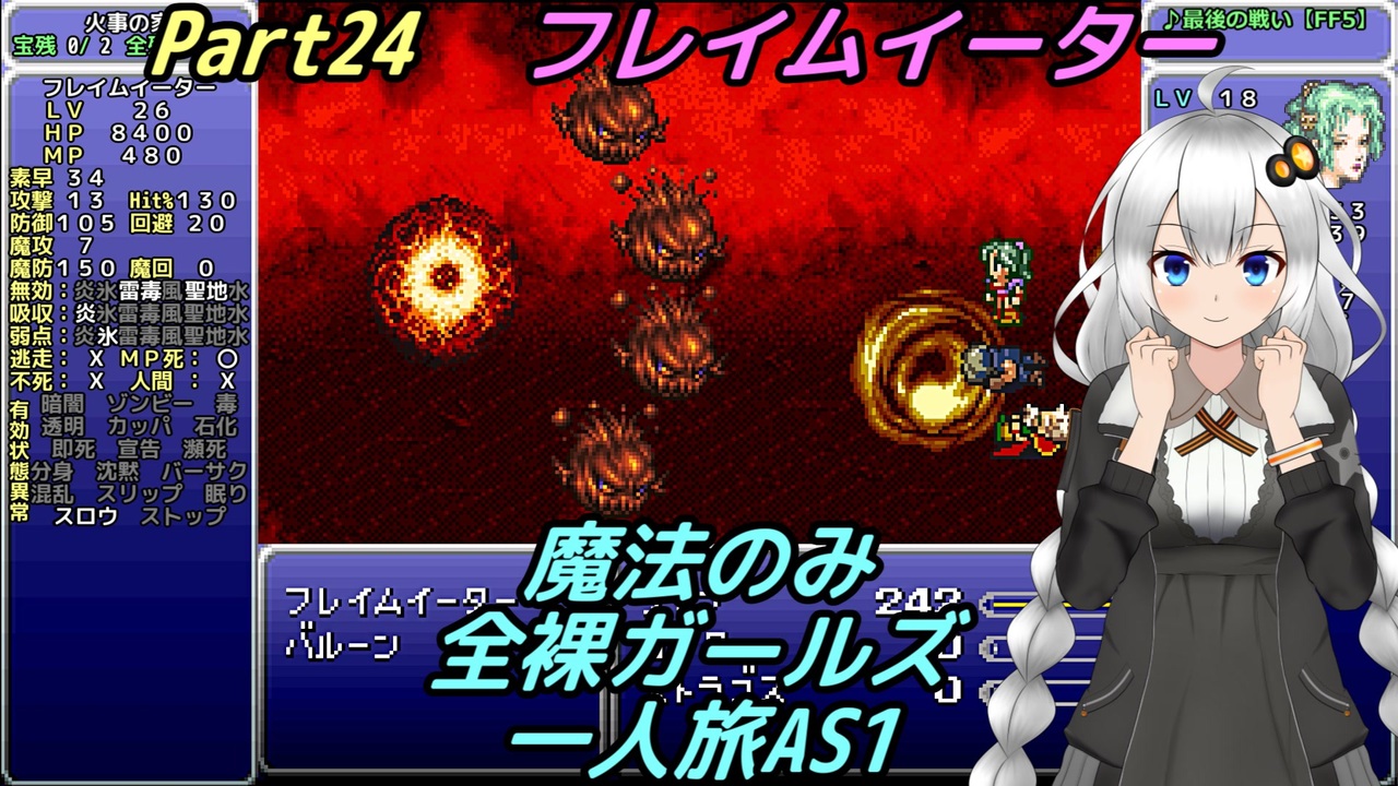 このロリコンどもめ!<br><br>・次回 … Part25 <a href="https://www.nicovideo.jp/watch/sm38108753" class="watch">sm38108753</a><br>・前回 … Part23 <a href="https://www.nicovideo.jp/watch/sm37843867" class="watch">sm37843867</a><br><br>・Youtube版 … <a href="https://youtu.be/LjSJJu6D-w8" target="_blank" rel="noopener nofollow">https://youtu.be/LjSJJu6D-w8</a><br>・字幕のみ … <a href="https://youtu.be/Z8LzdLcIloo" target="_blank" rel="noopener nofollow">https://youtu.be/Z8LzdLcIloo</a><br><br>【縛り内容】<br>1、魔法のみ<br>2、全裸(魔石はあり)<br>3、ガールズ<br>4、一人旅<br>5、アクティブ バトルスピード1 メッセージスピード1 詳細:<a href="https://www.nicovideo.jp/watch/sm34595412" class="watch">sm34595412</a><br>6、逃げられない!!表示の連射禁止<br>7、ボスの即死は禁止<br>8、宝物は全て集める<br>9、不具合やバグは不可<br>10、可能な限り低レベル<br>11、コマンド短縮やカーソル記憶しない<br>12、セーブ可能な場所でのみアイテム可<br>13、一部ストーリー上の編成でやむを得ない場合は最低限<br /><br>ふよふよしているの<br>絵:横沢さわらさん VOICEVOX:WhiteCUL<br><br>【シリーズ】<br>くうねるきゃんぷ … <a href="https://www.nicovideo.jp/series/516069" target="_blank" rel="noopener">series/516069</a><br>お写んぽ! … <a href="https://www.nicovideo.jp/series/435756" target="_blank" rel="noopener">series/435756</a><br>様子がおかしい! … <a href="https://www.nicovideo.jp/series/418875" target="_blank" rel="noopener">series/418875</a><br>FF7 魔法マテリアのみ初期防具ガールズ一人旅ASM … <a href="https://www.nicovideo.jp/series/438696" target="_blank" rel="noopener">series/438696</a><br>きんかつ!V-STROM1050XT … <a href="https://www.nicovideo.jp/series/144466" target="_blank" rel="noopener">series/144466</a><br>FF6 魔法のみ全裸ガールズ一人旅AS1 … <a href="https://www.nicovideo.jp/series/9438" target="_blank" rel="noopener">series/9438</a><br>おバイク!GLADIUS400 ABS … <a href="https://www.nicovideo.jp/series/68579" target="_blank" rel="noopener">series/68579</a><br>FF5 魔法のみ全裸一人旅AS1 … <a href="https://www.nicovideo.jp/series/9432" target="_blank" rel="noopener">series/9432</a><br>DQ3 呪文のみ全裸一人旅 … <a href="https://www.nicovideo.jp/series/9416" target="_blank" rel="noopener">series/9416</a><br>DQ2 ムーンブルクの王女一人旅 … <a href="https://www.nicovideo.jp/series/9414" target="_blank" rel="noopener">series/9414</a><br>DQ1 全裸 … <a href="https://www.nicovideo.jp/series/9412" target="_blank" rel="noopener">series/9412</a><br>FE 紋章の謎 天馬騎士単騎 第2部 英雄戦争 … <a href="https://www.nicovideo.jp/series/9404" target="_blank" rel="noopener">series/9404</a><br>FE 紋章の謎 天馬騎士単騎 第1部 暗黒戦争 … <a href="https://www.nicovideo.jp/series/9401" target="_blank" rel="noopener">series/9401</a><br>聖剣2 全裸プリム一人旅 武器Lv1など … <a href="https://www.nicovideo.jp/series/9396" target="_blank" rel="noopener">series/9396</a><br>ロマサガ2 魔術士不得意武器のみ … <a href="https://www.nicovideo.jp/series/9388" target="_blank" rel="noopener">series/9388</a><br>ロマサガ1 術法のみ一人旅で各イベント攻略 … <a href="https://www.nicovideo.jp/series/9386" target="_blank" rel="noopener">series/9386</a><br><br>SNSとか色々なリンク … <a href="https://lit.link/Unaa" target="_blank" rel="noopener nofollow">https://lit.link/Unaa</a>