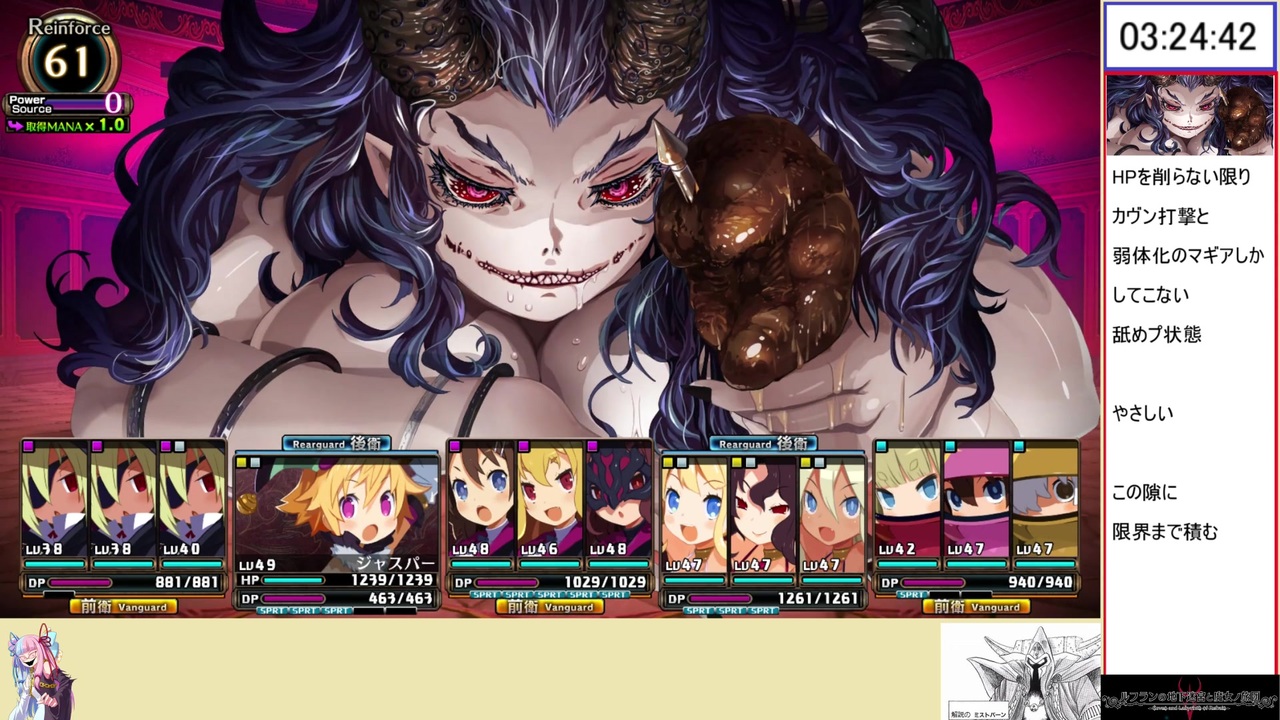 <i>書くことが思いつかなくなってきたんで初投稿です</i><br><br>コメ返し<br><br>Q.またって言うけどもう真っ黒で誰かわからないよ<br>A.お~いヌッタ~!スケープゴートしようぜ~!<br><br>Q.なんか今パートゲームBGMおっきくない? ずっとこのくらいだったっけ…<br>A.ゲームBGMが琴葉ボイスに対して大きいとは序盤から思っていたのでシリーズが進むたびにゲーム内音量は小さくしていってます<br> それでも大きく感じるならステージによりBGMの音量に元から差があるのではないかと思います<br> ぶっちゃけ俺もここだけやけに大きいなと思った<br><br>Q.ここに出てくる聖獣とか言う害獣嫌い<br> どう見ても頭が性獣<br> チンヘッド(先祖)<br>A.はえ~やっぱ皆嫌いなんすね~<br><br>Q.787(782)<br>A.なぜばれたし<br><br>Q.特に何事もなく(ジャスパー君死亡)<br>A.戦闘不能だから・・・<br><br>前><a href="https://www.nicovideo.jp/watch/sm37956225" class="watch">sm37956225</a><br>次><a href="https://www.nicovideo.jp/watch/sm37978971" class="watch">sm37978971</a><br><br>Twitter@tNK3ob36cqRwyJE<br><br>走ったRTA <a href="https://www.nicovideo.jp/mylist/69986578" target="_blank" rel="noopener">mylist/69986578</a><br><br>広告者様<br><br>一般通過PW さん とっこま さん 内藤春人 さん Kaz さん かなぎ さん 坂東ディー さん アロハ さん クボ さん GGG さん<br><br>広告ありがとうございます!<br><br>©Nippon Ichi Software, Inc.<br>
