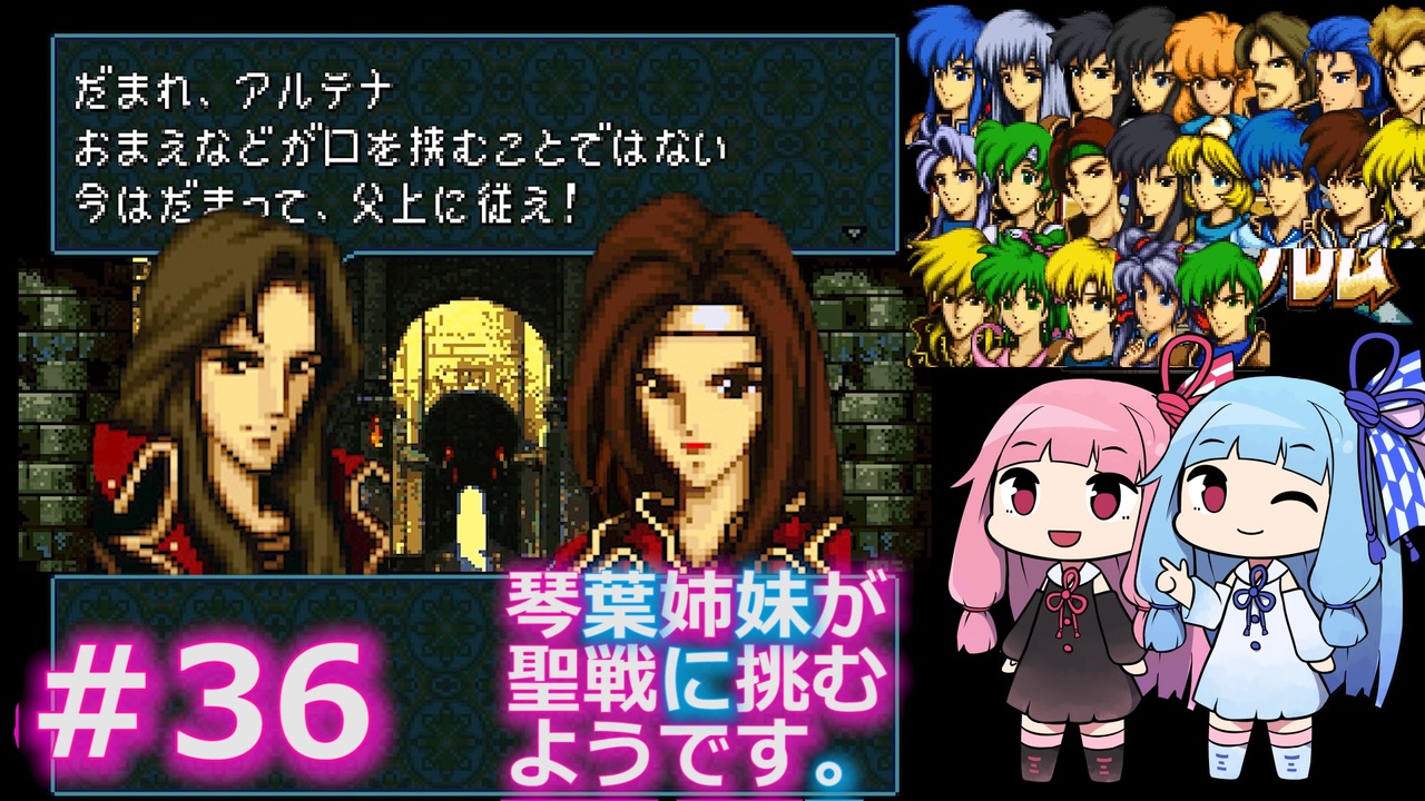 前<a href="https://www.nicovideo.jp/watch/sm37924247" class="watch">sm37924247</a> <a href="https://www.nicovideo.jp/mylist/68640421" target="_blank" rel="noopener">mylist/68640421</a> 次<a href="https://www.nicovideo.jp/watch/sm37997001" class="watch">sm37997001</a><br><br>セリス軍は破竹の勢いで進撃した。イザークを帝国の支配から取り戻しイードのダークマージを駆逐しトラキア半島のフリージ家を追い払ってマンスターまでその手を伸ばした。はじめは小さな勢力だった解放軍も地方の協力を得て今では城に入りきらないほどの集団になった。リーフとセティのレジスタンスも合流し士気も高い。マンスターを襲ったトラキア王国と事を構えることになったがどちらに勢いがあるかは明白だった。規模だけならシグルドたちよりもずっとでかいな、と琴葉茜は城の食堂で食事をしながら思った。「それでね、バッタバッタと敵を倒してるときに折れちゃったんだよ……風の剣が!」隣では葵が懐かしい話をしていた。こんな話をしていたからシグルドたちと過ごした日々を思い出したのだろう。「えーッ!? そんな話聞いたことなかったなぁ。お母様いつもシグルド様やアイラ様の話ばかりして自分のことは話さなかったから」フィーが口元を手で覆いつつも目を輝かせている。「む、アイラ母様はどんな人だったんだ」その横でラクチェがフィーに顔を近づけた。「えっとね、動いたと思ったら敵兵が倒れてたとか一振りで五回切ったとか冗談みたいな話ばかりだったけど……ラクチェを見ていたら嘘じゃなかったんだって思った」それを聞いて茜は思わず笑ってしまった。嘘みたいなほんとの話は大体面白い。「ラクチェちゃんのご両親のアイラさんとホリンさんはね、二人とも好きあってるのは分かりきってるのにお互い素直になれなくて……」葵がうっとりした顔で語りだしている。「ねね、アカネ! あたしの両親のことは知ってるの?」テーブルにパティが身を乗り出した。その青い純粋な目を見ていて茜は思った。シグルドたちよりもずっと距離が近いなと。貴族や騎士だとかめんどくさいこと抜きに気楽に話せることなんてあんまりなかったかもしれない。葵がこんなに生き生きと誰かと話してるところは見たことなかったかもしれない。茜はパティの頭をガシガシと撫でてやるとにやりと笑って言った。<br>「もちろん知ってるで。あいつらはな……」<br><br>無垢な子供たちにあることないこと吹き込む茜ちゃんはいないと思うので忘れてください。
