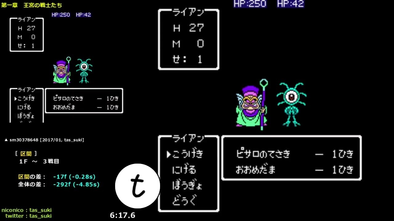 第一章は6秒半くらい縮まりました。(嬉しい)<br><br><br>FC ドラゴンクエスト4(ドラクエ4, DQ4)導かれし者たち のTASの試走です。<br>以前に投稿した TAS (<a href="https://www.nicovideo.jp/watch/sm30378648" class="watch">sm30378648</a>, <strong>tas_suki</strong>, 2017/01 - 2018/01) と<br>あまり変わらない内容になりそうな気がしますが、<br>やっぱり1時間50分を切りたくてもう一度作ることにしました。<br><br>とりあえず、このパートは 6.5秒くらい (389f) 短縮できました。<br><br>フレーム数 : 32951F<br>追記数 : 44440<br><br>2/7 第二章 → <a href="https://www.nicovideo.jp/watch/sm38320446" class="watch">sm38320446</a><br><br><br>[過去に投稿した主な ド◯◯◯ の TAS]<br><a href="https://www.nicovideo.jp/watch/sm35679196" class="watch">sm35679196</a> GBC ドラゴンクエスト1<br><a href="https://www.nicovideo.jp/watch/sm35756728" class="watch">sm35756728</a> GBC ドラゴンクエスト2<br><a href="https://www.nicovideo.jp/watch/sm33886362" class="watch">sm33886362</a> FC MUSIC TYPE FEVER<br><br><span style="color: #45818e; font-size: 10px;">この動画で利用している株式会社スクウェア・エニックスを代表とする共同著作者が権利を所有する著作物及びスギヤマ工房有限会社が権利を所有する楽曲の転載・配布は禁止いたします。<br> © 1990 ARMOR PROJECT/BIRD STUDIO/SPIKE CHUNSOFT/SQUARE ENIX All Rights Reserved.<br> © SUGIYAMA KOBO</span><br><br /><br>------------- 以下 共通説明文 -------------<br><br><strong>PIXIV FANBOX や Amazon にて支援を募っています。よかったらぜひ。<br>FANBOX : <a href="https://www.fanbox.cc/@tas-suki" target="_blank" rel="noopener nofollow">https://www.fanbox.cc/@tas-suki</a><br>Wish List : <a href="https://www.amazon.co.jp/hz/wishlist/ls/3M57V3BKOO1N9" target="_blank" rel="noopener nofollow">https://www.amazon.co.jp/hz/wishlist/ls/3M57V3BKOO1N9</a></strong><br><br><strong>twitter : <a href="https://twitter.com/tas_suki" target="_blank" rel="noopener nofollow">https://twitter.com/tas_suki</a><br>RTA : <a href="https://www.speedrun.com/user/tas_suki" target="_blank" rel="noopener nofollow">https://www.speedrun.com/user/tas_suki</a></strong><br><br><span style="color: #20124d;"><strong>※ 2021/10 以降は、不定期に動画を投稿しています。</strong></span><br><br> ・Posted TASes (recently)<br>05/31 <a href="https://www.nicovideo.jp/watch/sm42293404" class="watch">sm42293404</a> (PC)<br>04/30 <a href="https://www.nicovideo.jp/watch/sm42136556" class="watch">sm42136556</a> (PC)<br>02/28 <a href="https://www.nicovideo.jp/watch/sm41812217" class="watch">sm41812217</a> (MD)<br>12/25 <a href="https://www.nicovideo.jp/watch/sm41553821" class="watch">sm41553821</a> (PC)<br>11/08 <a href="https://www.youtube.com/watch?v=Lj6N0bm3lyo" target="_blank" rel="noopener nofollow">https://www.youtube.com/watch?v=Lj6N0bm3lyo</a> (PC)<br>09/29 <a href="https://www.youtube.com/watch?v=gRelRaVcyQg" target="_blank" rel="noopener nofollow">https://www.youtube.com/watch?v=gRelRaVcyQg</a> (PC)<br>07/01 <a href="https://www.youtube.com/watch?v=28G366IdmPE" target="_blank" rel="noopener nofollow">https://www.youtube.com/watch?v=28G366IdmPE</a> (PC)<br>05/31 <a href="https://www.nicovideo.jp/watch/sm40538452" class="watch">sm40538452</a> (PC)<br><br> ・Posted TASes (2016/04 ~ )<br><a href="http://www.nicovideo.jp/user/56935712/video" target="_blank" rel="noopener nofollow">http://www.nicovideo.jp/user/56935712/video</a><br><br> ・Posted TASes that are the current fastest records<br><a href="https://www.nicovideo.jp/series/74250" target="_blank" rel="noopener nofollow">https://www.nicovideo.jp/series/74250</a>