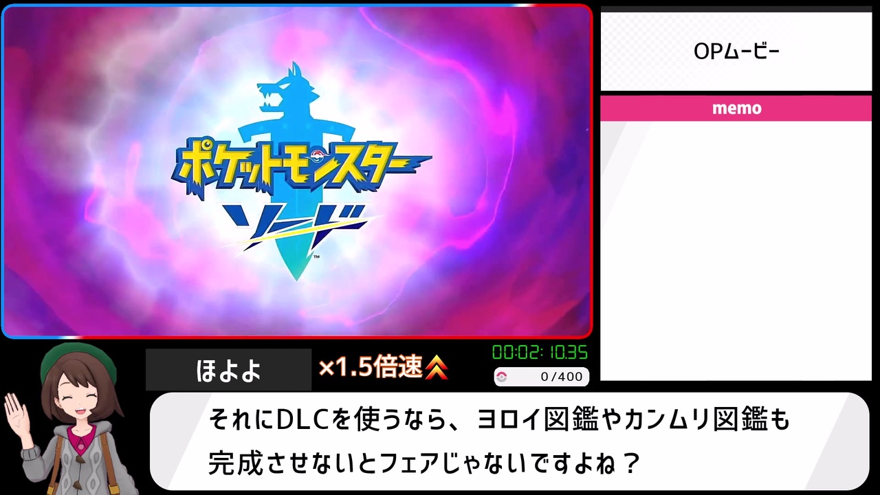 RTAは初投稿です<br><br><span style="color: #ff0000;">※追記</span><br>ゲームBGMがゆっくり音声に比べて極端に小さくなっています<br>次回からはきちんと調整するのですいません、許してください<br><strong>音量調整版を上げ直しました </strong><a href="https://www.nicovideo.jp/watch/sm38067141" class="watch">sm38067141</a><br><br>でんどういりまでのチャートはこちらを参考にしました<br><a href="https://ch.nicovideo.jp/article/ar1842828" target="_blank" rel="noopener">ar1842828</a> <a href="https://ch.nicovideo.jp/article/ar1754247" target="_blank" rel="noopener">ar1754247</a><br><br>レギュレーション?<br>・計測開始は名前を入力して「はい」を押してから<br>・計測終了はガラル図鑑400匹を完成させて表彰状が表示されたら<br>・Switchを2台、ソード・シールドを1つずつ使用<br>・言語は日本語を選択<br>・通信操作以外でのSwitchの2台同時操作禁止<br>・通信は2台のSwitch間およびNPCのみで、オンライン通信は禁止<br>・シリアルコード等の特典の使用禁止<br>・DLC要素(鎧の孤島・冠の雪原)の使用禁止<br>・Pokemon HOMEの使用禁止<br><br>このパート:さいしょから~ワイルドエリアまで<br><br>まえ:ないです つぎ:<a href="https://www.nicovideo.jp/watch/sm38035597" class="watch">sm38035597</a><br>マイリスト:<a href="https://www.nicovideo.jp/mylist/70240497" target="_blank" rel="noopener">mylist/70240497</a>
