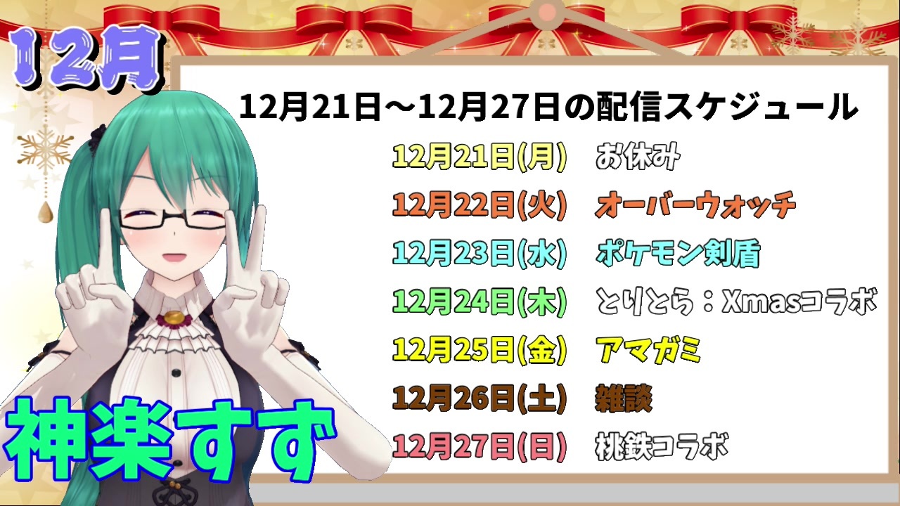 凄みのあるタイトルですが、割といつもどおりです<br><br>12月21日~12月27日の神楽すずさんの個人配信の<br>週間ダイジェストみたいなやつです<br><br>一応、不定期更新(月、火にだいたい更新してる)<br><br>あくまで個人配信を中心に作成しているのでコラボやイベント等は<br>スケジュール表のみの掲載となると思うのでよろしくお願いします<br>( コラボは稀に単発で動画を出したり出さなかったりします )<br><br>先週の:<a href="https://www.nicovideo.jp/watch/sm37986433" class="watch">sm37986433</a> 来週の:<a href="https://www.nicovideo.jp/watch/sm38074814" class="watch">sm38074814</a><br><br>とりとら関連については、是非本人達のツイッターで確認してみてね!<br>(入れるのすっかり忘れてた☆)<br><br>元動画<br>使えるキャラを増やしたいです!!!!<br><a href="https://www.mildom.com/playback/10596385/10596385-bvgvmbgoiibqp5fb6th0" target="_blank" rel="noopener nofollow">https://www.mildom.com/playback/10596385/10596385-bvgvmbgoiibqp5fb6th0</a><br><br>【ポケモン剣】私の考える最強ハーレムPTで楽しむやつ#06<br><a href="https://www.youtube.com/watch?v=Sjb0CDHElXw" target="_blank" rel="noopener nofollow">https://www.youtube.com/watch?v=Sjb0CDHElXw</a><br><br>【アマガミ】クリスマスだし、絢辻さんのスキベストクリアしたい<br><a href="https://www.youtube.com/watch?v=dVPNg8z3Tm0" target="_blank" rel="noopener nofollow">https://www.youtube.com/watch?v=dVPNg8z3Tm0</a><br><br>【アマガミ】クリスマスだし、絢辻さんのスキベストクリアしたい後半<br><a href="https://www.youtube.com/watch?v=9klU69w5Lgg" target="_blank" rel="noopener nofollow">https://www.youtube.com/watch?v=9klU69w5Lgg</a><br><br>雑談・いろいろ変わってるのを忘れてた<br><a href="https://www.youtube.com/watch?v=d0aa47XkKdE" target="_blank" rel="noopener nofollow">https://www.youtube.com/watch?v=d0aa47XkKdE</a><br><br><br>☆神楽すずさんのチャンネル<br><a href="https://www.youtube.com/channel/UCUZ5AlC3rTlM-rA2cj5RP6w/featured" target="_blank" rel="noopener nofollow">https://www.youtube.com/channel/UCUZ5AlC3rTlM-rA2cj5RP6w/featured</a><br><br><br>(C)Appland, Inc.