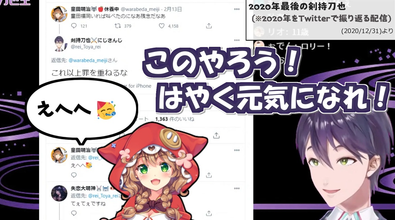 お大事に<br>・童田明治 <br><a href="https://www.youtube.com/channel/UCveZ9Ic1VtcXbsyaBgxPMvg?sub_confirmation=1" target="_blank" rel="noopener nofollow">https://www.youtube.com/channel/UCveZ9Ic1VtcXbsyaBgxPMvg?sub_confirmation=1</a><br>・剣持刀也<br><a href="https://www.youtube.com/channel/UCv1fFr156jc65EMiLbaLImw?sub_confirmation=1" target="_blank" rel="noopener nofollow">https://www.youtube.com/channel/UCv1fFr156jc65EMiLbaLImw?sub_confirmation=1</a><br><br>・元動画<br>▼2020年最後の剣持刀也(2020/12/31)<br><a href="https://www.youtube.com/watch?v=iiH09_jnwYw" target="_blank" rel="noopener nofollow">https://www.youtube.com/watch?v=iiH09_jnwYw</a><br>該当箇所(45:47~)<br><a href="https://youtu.be/iiH09_jnwYw?t=2747" target="_blank" rel="noopener nofollow">https://youtu.be/iiH09_jnwYw?t=2747</a><br>該当箇所(52:48~)<br><a href="https://youtu.be/iiH09_jnwYw?t=3168" target="_blank" rel="noopener nofollow">https://youtu.be/iiH09_jnwYw?t=3168</a>