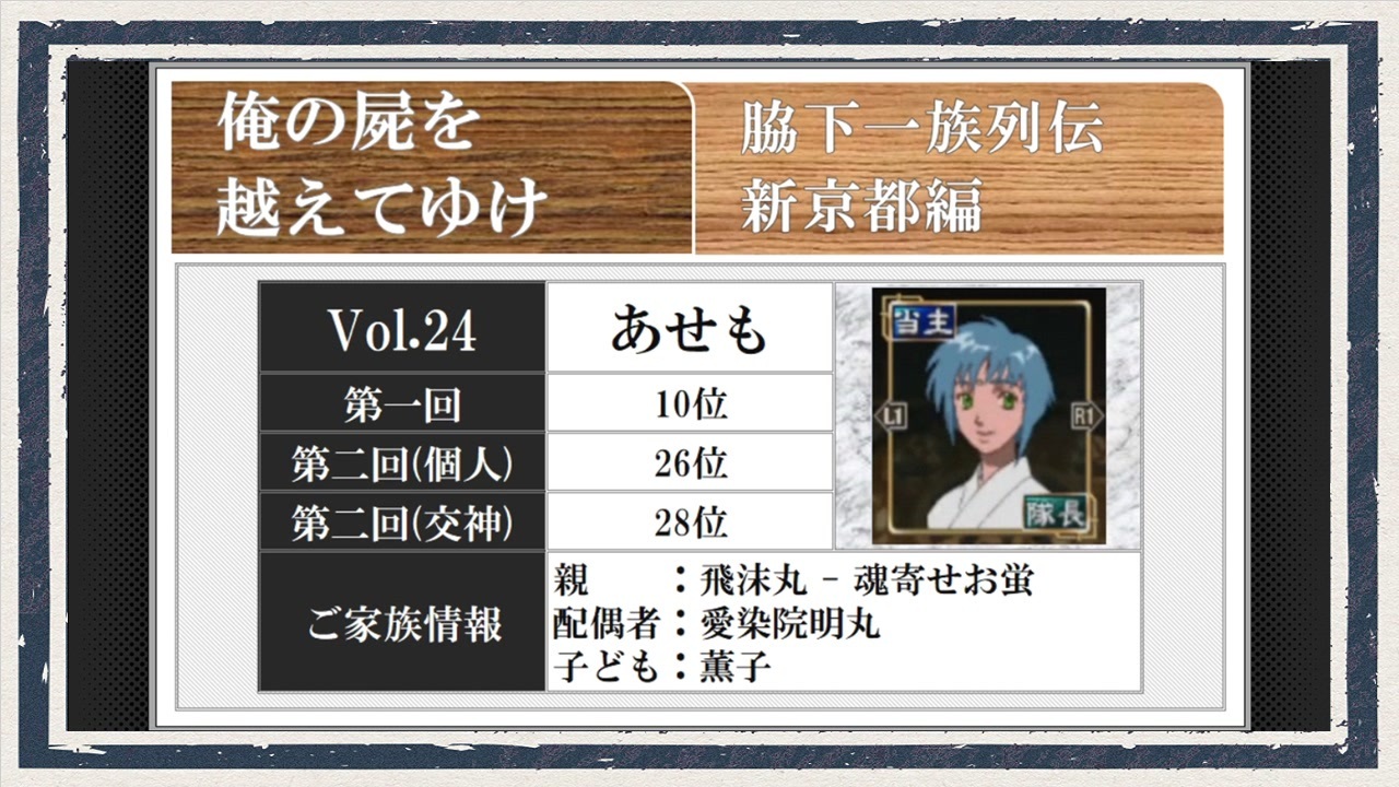 <strong>うちの一族の話を聞いてくれ<br>※一族1人1人について、ただ語っていくだけの動画です</strong><br><br>『新京都 メッセージ追加募集係』宛にお願いします。<br><br>今年後半は身動きが取れず、全然動画が作れずすみませんでした。<br><br>2020年は何とか3本…<br>来年は完結に向けて、頑張ろうと思います。<br><br>vol.23 : 乱香 ⇒<a href="https://www.nicovideo.jp/watch/sm37161468" class="watch">sm37161468</a><br>vol.25 : なめ七 ⇒<a href="https://www.nicovideo.jp/watch/sm38199633" class="watch">sm38199633</a><br><br>マイリスト⇒<a href="https://www.nicovideo.jp/mylist/45061999" target="_blank" rel="noopener">mylist/45061999</a><br><br>▽ Twitter<br><a href="http://twitter.com/fuhiky" target="_blank" rel="noopener nofollow">http://twitter.com/fuhiky</a> <br>