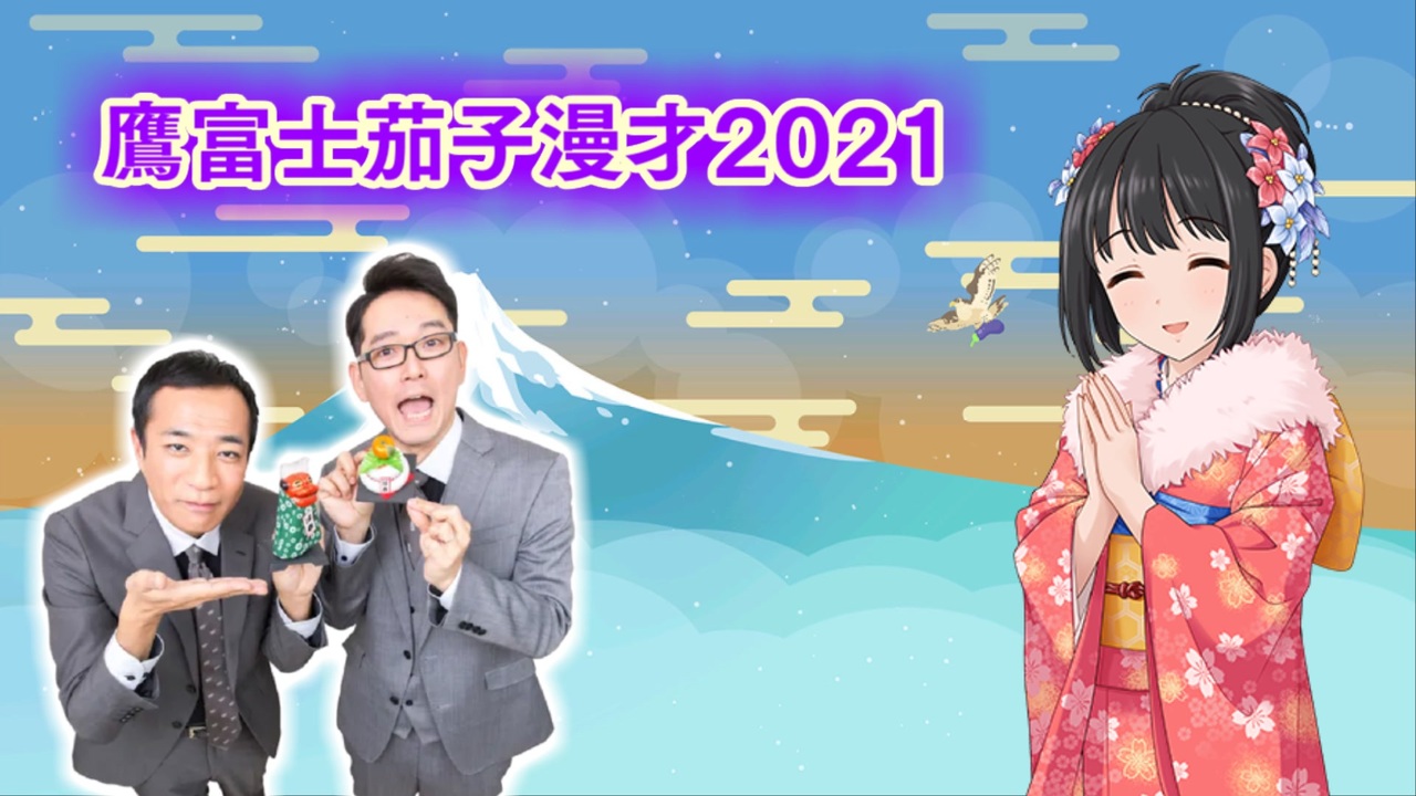 <span style="color: #9900ff; font-size: 24px;"><strong>【鷹富士茄子漫才2021】</strong></span><br><br><span style="color: #ff9900; font-size: 18px;"><strong>塙P「歌鈴ちゃんとのユニット名が『バナナナス』」</strong></span><br><span style="color: #0000ff; font-size: 18px;"><strong>土屋P「微妙に公式っぽいのやめなさいよ」</strong></span><br><br><span style="font-size: 24px;"><strong>【ナイツ】</strong></span><br><br><span style="color: #ff0000; font-size: 24px;"><strong> \祝・2021年元旦/</strong></span><br><span style="color: #9900ff; font-size: 24px;"><strong>\鷹富士茄子生誕祭2021/</strong></span><br><span style="color: #980000; font-size: 24px;"><strong>\道明寺歌鈴生誕祭2021/</strong></span><br><br>あけましておめでとうござい〼<br><br>新春・ネタ初め、初笑い!ということで定番のナイツです。<br><br>……が、三日前から無理やりつくった年賀状代わりの動画なので、<br>色々とっ散らかっております。コメントで面白くしてください(挑戦状)<br><br>ともあれ。<br><br><span style="color: #ff00ff; font-size: 18px;"><strong>2021年が、皆さまにとって幸せな一年となりますように!</strong></span><br><br>~日記~<br><br>サムネ凝ってる時間なかった<br>あと歌鈴ちゃんネタに入れられなくてごめんね……<br>2022年はもっと頑張ります(来年の抱負RTA)<br><br>今年も気の向くままに色々やろうと思います。<br>アイマス漫才ともどもご贔屓に!<br><br>追記 1/5<br><span style="color: #9900ff; font-size: 24px;"><strong> 茄子さんソロ曲おめでとう!!!</strong></span><br><br><br>前 → <a href="https://www.nicovideo.jp/watch/sm37851445" class="watch">sm37851445</a><br>次 → <a href="https://www.nicovideo.jp/watch/sm38723169" class="watch">sm38723169</a><br /><span style="color: #000000; font-size: 14px;">※ この動画は実在のお笑い芸人さんのネタのパロディおよび物真似です。ご了承ください。</span><br><br><strong>これまでのお笑いm@ster</strong>:<a href="https://www.nicovideo.jp/mylist/67741577" target="_blank" rel="noopener">mylist/67741577</a><br><strong>Twitter</strong>:<a href="https://twitter.com/enishi910" target="_blank" rel="noopener nofollow">https://twitter.com/enishi910</a>