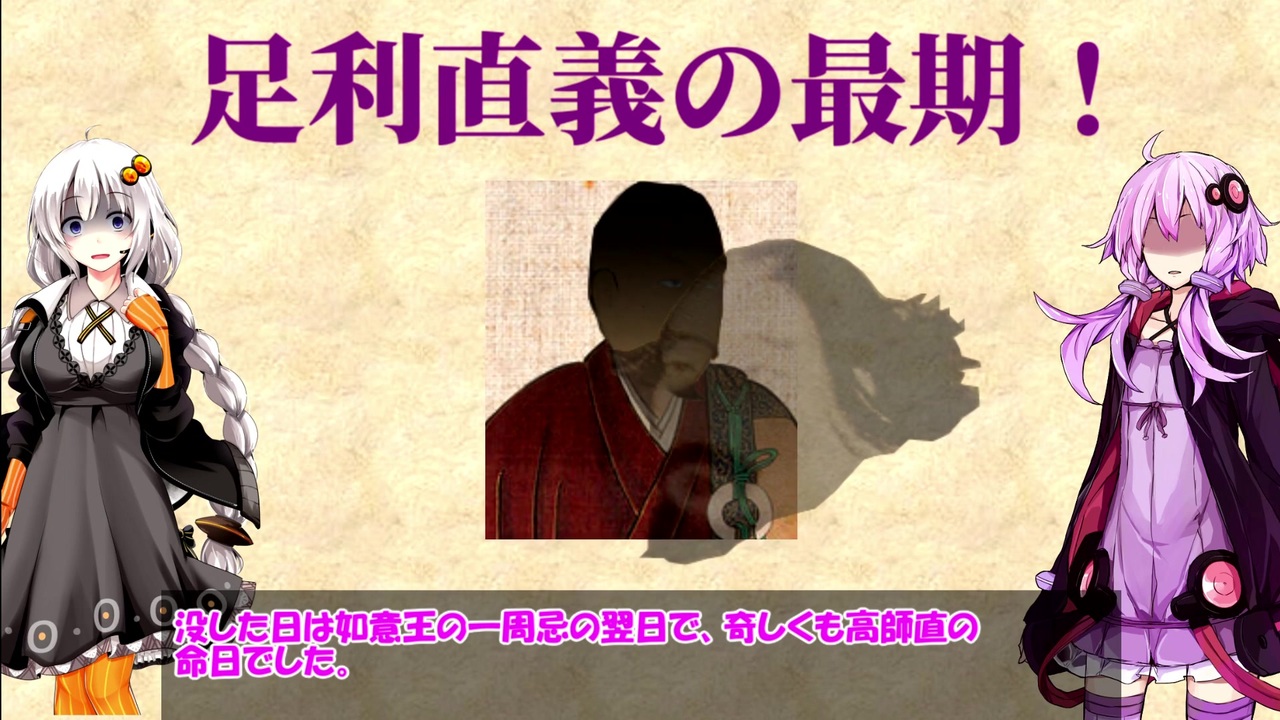 八十八(やそや)です。<br>このシリーズは斯波高経の生涯(以下略)観応の擾乱の解説です。<br>観応の擾乱に至る経緯から足利直義の死までを扱う3部構成で、本編はその最終回。足利直義の政権復帰後の顛末を描きます。<br><br>【きずゆか中世史:裏足利家の興亡】<br>観応の擾乱① はじめての御所巻! <a href="https://www.nicovideo.jp/watch/sm37976740" class="watch">sm37976740</a><br>前:観応の擾乱② ほんとうは悪くない? 高師直 <a href="https://www.nicovideo.jp/watch/sm38023882" class="watch">sm38023882</a><br>次:英雄!足利尊氏 <a href="https://www.nicovideo.jp/watch/sm38299148" class="watch">sm38299148</a><br><br>ツイッター:<a href="https://twitter.com/yasoya_night" target="_blank" rel="noopener nofollow">https://twitter.com/yasoya_night</a><br><br><br>(参考にしたもの:敬称略)<br>WikiPedia「足利直義」他の記事<br>神田本太平記他:国立国会図書館デジタルコレクション<br>観応の擾乱:亀田俊和<br>足利尊氏と直義 京の夢、鎌倉の夢:峰岸純夫<br>足利直義 下知、件の如し:亀田俊和<br>高師直室町新秩序の創造者:亀田俊和<br>高一族と南北朝内乱:亀田俊和<br>足利直義:森茂暁<br>陰謀の日本中世史:呉座勇一<br>室町幕府 全将軍・管領列伝:平野明夫・日本史史料研究会<br>初期室町幕府研究の最前線:亀田俊和・日本史史料研究会<br>国別 守護・戦国大名辞典:西ヶ谷恭弘<br>ピクトリアル足利尊氏 南北朝の騒乱:永原慶二総監修<br>歴史群像シリーズ⑩戦乱南北朝:学研歴史群像シリーズ編集部<br>倉山満が読み解く太平記の時代:倉山満<br>太平記の時代:新田一郎<br>太平記の世界 変革の時代を読む:永積安明・上横手政敬・桜井好朗<br><br>(補足)足利直義の理非糾明と足利義詮の一方的裁許について、<br>「観応の擾乱」著者の亀田俊和様よりご指摘いただきました。足利直義の裁判でも論人(被告)からの反論が出ない場合は原則一方的裁許になる。違いは直義は反論の機会を設けるが、義詮はそれすらしないということだそうです。併せて動画制作にあたり著書を大いに参考とさせていただきました。この場をお借りして御礼申し上げます。