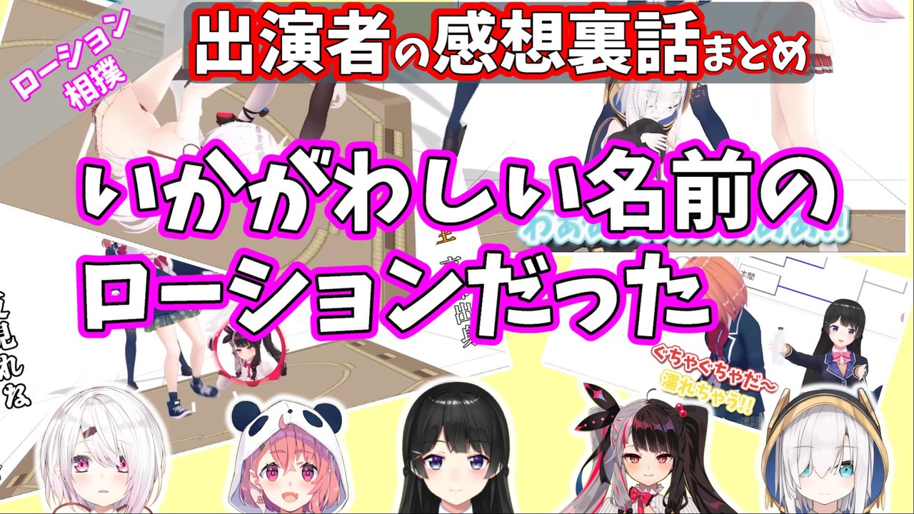 『第一回』はこれから助かる予感<br><br><a href="#" class="seekTime" data-seekTime="0:00" onclick="seekNicoPlayer('#0:00'); return false;">#0:00</a> 月ノ美兎<br><a href="#" class="seekTime" data-seekTime="1:12" onclick="seekNicoPlayer('#1:12'); return false;">#1:12</a> 笹木咲<br><a href="#" class="seekTime" data-seekTime="1:54" onclick="seekNicoPlayer('#1:54'); return false;">#1:54</a> 椎名唯華<br><a href="#" class="seekTime" data-seekTime="2:38" onclick="seekNicoPlayer('#2:38'); return false;">#2:38</a> アルスアルマル<br><a href="#" class="seekTime" data-seekTime="4:12" onclick="seekNicoPlayer('#4:12'); return false;">#4:12</a> 夜見れな<br>※企画側のほんひまもいれたかったけど編集時点で見つからなかったすまんこの動画で勘弁してください<br>【追記】<br>有識者のおかげでほんひま見つけたので再編集&追加版作成しました→<a href="https://www.nicovideo.jp/watch/sm38083487" class="watch">sm38083487</a><br><br><br>◆第一回 Vtuber女子 ローション相撲大会<br><a href="https://www.youtube.com/watch?v=93qo-YWSdQE" target="_blank" rel="noopener nofollow">https://www.youtube.com/watch?v=93qo-YWSdQE</a><br><br>◆元動画<br>色褪せた世紀末を散歩しながら雑談する【Skyrim/にじさんじ/月ノ美兎】<br><a href="https://www.youtube.com/watch?v=U0bmg8e9LlQ" target="_blank" rel="noopener nofollow">https://www.youtube.com/watch?v=U0bmg8e9LlQ</a><br><br>ドラクエのカジノに行って豪遊やよ!【にじさんじ/笹木咲】<br><a href="https://www.youtube.com/watch?v=Wj5o6-v9WqY" target="_blank" rel="noopener nofollow">https://www.youtube.com/watch?v=Wj5o6-v9WqY</a><br><br>【雑談】ゴリスナー総会☆彡今年もみんなでたのしむぞ!【椎名唯華にじさんじ】<br><a href="https://www.youtube.com/watch?v=v5cUeUgStYg" target="_blank" rel="noopener nofollow">https://www.youtube.com/watch?v=v5cUeUgStYg</a><br><br>58【Minecraft 】あの~おみくじ1つください season2【アルス・アルマル/にじさんじ】<br><a href="https://www.youtube.com/watch?v=mEa7lrY3yu4" target="_blank" rel="noopener nofollow">https://www.youtube.com/watch?v=mEa7lrY3yu4</a><br><br>【 minecraft 】初詣をした後、鳩時計の建築を進める【夜見れな/にじさんじ】<br><a href="https://www.youtube.com/watch?v=w4Mi7lqD0iE" target="_blank" rel="noopener nofollow">https://www.youtube.com/watch?v=w4Mi7lqD0iE</a><br><br><span style="color: #b7b7b7;">▷</span><span style="color: #b7b7b7; font-size: 10px;">Vつべの助かる切り抜き(YouTube)→<a href="http://www.youtube.com/channel/UCTk7oeLeSCOO4Kb14-pHWYA" target="_blank" rel="noopener nofollow">http://www.youtube.com/channel/UCTk7oeLeSCOO4Kb14-pHWYA</a></span>