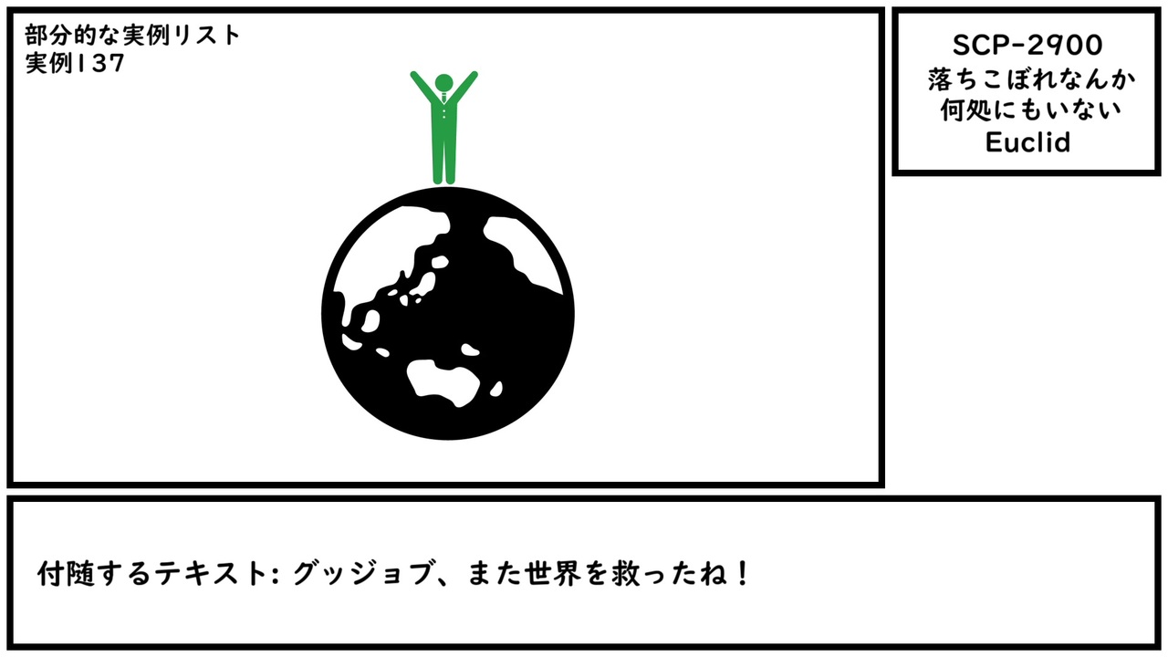 賞の形式: ████動画のロゴが描かれた金のトロフィー<br>付随するテキスト: この動画を再生しました!<br>受賞者: ████動画の視聴者<br><br>本家記事 <a href="http://scp-wiki.wikidot.com/scp-2900" target="_blank" rel="noopener nofollow">http://scp-wiki.wikidot.com/scp-2900</a><br>翻訳記事 <a href="http://scp-jp.wikidot.com/scp-2900" target="_blank" rel="noopener nofollow">http://scp-jp.wikidot.com/scp-2900</a><br>作者 Pixeltasim<br>SCP財団 <a href="http://scp-jp.wikidot.com" target="_blank" rel="noopener nofollow">http://scp-jp.wikidot.com</a><br>過去の動画はこちら <a href="https://www.nicovideo.jp/mylist/67620202" target="_blank" rel="noopener">mylist/67620202</a><br>CC-BY-SA 3.0<br>