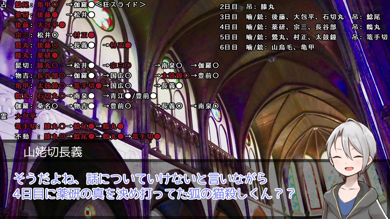 12万で2ねね1お頭1包平です。10万の壁ェ…ですかね。<br><strong>配役:村7/占2/霊2/狩1/共3/猫1/狼8/狂3/狐3</strong><br><br>今まで名前欄に手打ちで「/共有」とか入れてたんですが今回入れ忘れましたへへ…<br><strong>※狩人は毎</strong><span style="font-size: 16px;"><strong>夜</strong></span><strong>、SP狼は偶数日の</strong><span style="font-size: 16px;"><strong>夜</strong></span><strong>、SP狐は3の倍数日の</strong><span style="font-size: 16px;"><strong>夜</strong></span><strong>に銃殺できます。</strong><br><br><a href="https://www.nicovideo.jp/watch/sm38065079" class="watch">sm38065079</a>←5日目|<a href="https://www.nicovideo.jp/mylist/65368586" target="_blank" rel="noopener">mylist/65368586</a>|<span style="font-size: 16px;">7日目→<a href="https://www.nicovideo.jp/watch/sm38101932" class="watch">sm38101932</a></span><br><br />だてぐみじんろう:<a href="https://www.nicovideo.jp/series/1107" target="_blank" rel="noopener">series/1107</a><br>→考察、感想をTwitterでつぶやくときは<strong>「#だてぐみじんろう」</strong>をどうぞ!私が喜びます。<br>ジョジョ卓:<a href="https://www.nicovideo.jp/series/29049" target="_blank" rel="noopener">series/29049</a><br>ダイマ動画:<a href="https://www.nicovideo.jp/series/29054" target="_blank" rel="noopener">series/29054</a><br>無人島開発:<a href="https://www.nicovideo.jp/series/112224" target="_blank" rel="noopener">series/112224</a><br>解説動画:<a href="https://www.nicovideo.jp/series/179736" target="_blank" rel="noopener">series/179736</a>