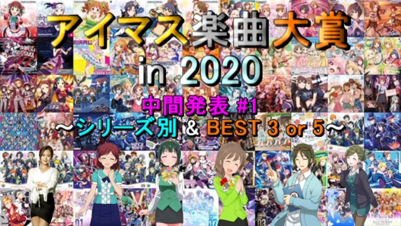 <span style="color: #ff0000;"><strong>2020年にFull音源版が発売 or 配信</strong></span>されたアイマス関連の楽曲<br>(<span style="color: #0000ff;"><strong>計113曲</strong></span>)に対する人気投票企画の<span style="color: #ff00ff;"><strong>中間発表1回目</strong></span>です。<br>参加者<span style="color: #00ff00;"><strong>500名</strong></span>の時点の結果から、<span style="color: #ff9900;"><strong>各シリーズでの獲得pt上位5曲</strong></span>を<br>それぞれご紹介します(A.アイマスのみ3曲紹介)。<br>※紹介順はその時点の順位に関係なくランダムです。<br>※楽曲情報とCD画像は一番最初に発売されたものを使用。<br><br><span style="font-size: 24px;">※最終結果完成しました!⇒</span><span style="font-size: 24px;"><strong><a href="https://www.nicovideo.jp/watch/sm38267159" class="watch">sm38267159</a></strong></span><br><br>☆投票対象曲一覧:<a href="https://ch.nicovideo.jp/article/ar1977185" target="_blank" rel="noopener">ar1977185</a><br>☆告知 & 対象曲紹介:<a href="https://www.nicovideo.jp/watch/sm38045615" class="watch">sm38045615</a><br>◆中間2回目(発売 or 配信月別):<a href="https://www.nicovideo.jp/watch/sm38145161" class="watch">sm38145161</a><br><br><br>●「アイマス楽曲大賞 最終結果まとめ」:<a href="https://www.nicovideo.jp/mylist/70533939" target="_blank" rel="noopener">mylist/70533939</a><br>●『アイマス楽曲ランキングシリーズ』:<a href="https://www.nicovideo.jp/mylist/57911966" target="_blank" rel="noopener">mylist/57911966</a><br>●『THE IDOLM@STER Song Collection』:<a href="https://www.nicovideo.jp/mylist/61493969" target="_blank" rel="noopener">mylist/61493969</a>