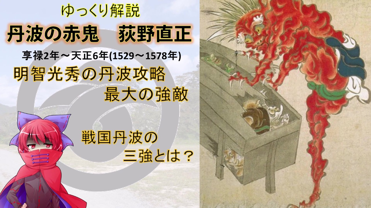 <span style="font-size: 18px;">せっかくだから大河ドラマに便乗したい</span><br><br>前回「大内義興」;<a href="https://www.nicovideo.jp/watch/sm37319746" class="watch">sm37319746</a><br>次回「三村家親・元親」;<a href="https://www.nicovideo.jp/watch/sm38162434" class="watch">sm38162434</a><br><br>「大内義興」 <a href="https://www.nicovideo.jp/watch/sm37319746" class="watch">sm37319746</a><br>「松永久秀」 <a href="https://www.nicovideo.jp/watch/sm37068501" class="watch">sm37068501</a><br>「明智光秀」 <a href="https://www.nicovideo.jp/watch/sm36955723" class="watch">sm36955723</a><br><br>初めまして、新年に夏休みを取ったしかかくです。<br>今回は「麒麟がくる」明智光秀の丹波平定戦にあやかって、丹波国の名将・荻野直正について解説します。<br>荻野直正(赤井直正)は”丹波の赤鬼”として知られていますが、そもそも戦国時代における丹波国の動乱については殆ど知られていないのが現状です。<br>そのため、荻野直正が養子として入った荻野家の没落から、赤井家の躍進、そして光秀の丹波平定戦までを幅広く解説します。<br><br>紹介動画<br>【室町時代ゆっくり解説】第十三回「波多野三兄弟と細川高国」; <a href="https://www.nicovideo.jp/watch/sm38048232" class="watch">sm38048232</a><br><br>追記<br>大河ドラマが思っていた以上にスピードが早かったため、荻野直正が先になりましたが、ちゃんと次回の三村家親・元親についても製作中です。<br>備中についての良質の史料が大量に手に入ったため、かなり3M(情報密・時間尺密・三村)な内容になると思います。<br><br>YouTube; <a href="https://www.youtube.com/channel/UCRyZjTeQgxd8iXcL2P8vwNA" target="_blank" rel="noopener nofollow">https://www.youtube.com/channel/UCRyZjTeQgxd8iXcL2P8vwNA</a><br>Twitter; <a href="https://twitter.com/SquareDeerHorn" target="_blank" rel="noopener nofollow">https://twitter.com/SquareDeerHorn</a><br><br><br>参考文献<br>小和田哲男『明智光秀・秀満:ときハ今あめが下しる五月哉』<br>高橋成計 『明智光秀を破った「丹波の赤鬼」~荻野直正と城郭』<br>木下昌規 『足利義晴と畿内動乱』<br>福島克彦 『畿内・近国の戦国合戦』<br>谷口克広 『信長の天下布武への道』<br>天野忠幸編『松永久秀 歪められた戦国の“梟雄”の実像』<br>柴裕之編 『織豊大名の研究8 明智光秀』<br>木下聡 「若狭武田氏の研究史とその系譜・動向」<br>福島克彦 「丹波内藤氏と内藤ジョアン」<br>福島克彦 「中世後期の丹波について~戦国期「丹波三強」の形成~」<br>中西裕樹 「室町・戦国期の籾井氏について」<br>小和田哲男「戦国丹波の城と武将たち」<br>馬部隆弘 「丹波片山家文書と守護代内藤国貞」<br>馬部隆弘 「内衆からみた細川氏綱と三好長慶の関係」<br>渡邊大門 「波多野氏の丹波国支配をめぐって」<br>「八木城と内藤氏ー戦国争乱の丹波ー」