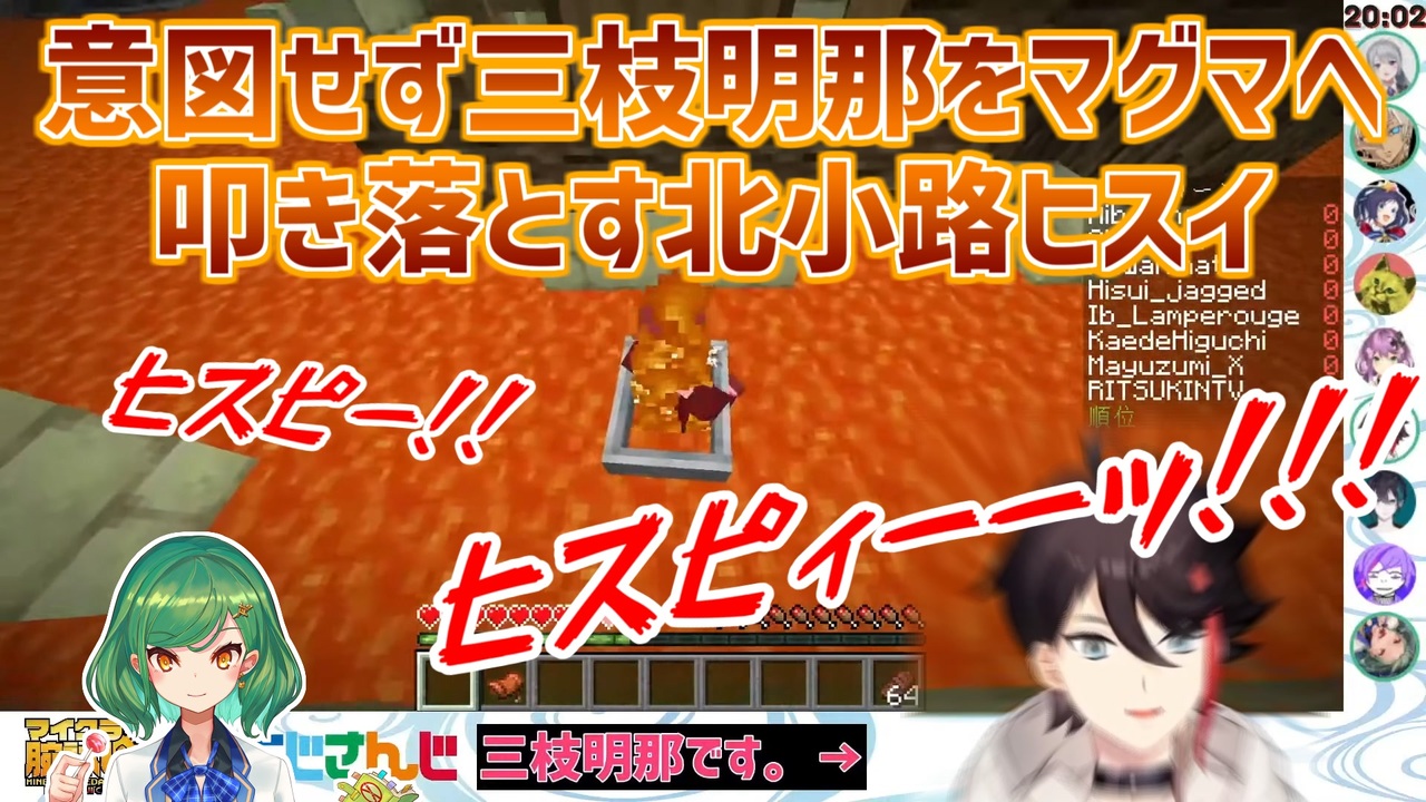 奇しくもシェリンと同様に焼け死んで脱落するとは<br>アッキーナ只者じゃねぇな<br><br>本家参考動画<br>・三枝明那<br><a href="https://youtu.be/J_ACoQcfUXc" target="_blank" rel="noopener nofollow">https://youtu.be/J_ACoQcfUXc</a><br>・北小路ヒスイ<br><a href="https://youtu.be/OGoyenB5Mug" target="_blank" rel="noopener nofollow">https://youtu.be/OGoyenB5Mug</a><br>・黛灰<br><a href="https://youtu.be/cyBsPcXmJok" target="_blank" rel="noopener nofollow">https://youtu.be/cyBsPcXmJok</a><br>・相羽ういは<br><a href="https://youtu.be/79pe20rbrHw" target="_blank" rel="noopener nofollow">https://youtu.be/79pe20rbrHw</a><br>・イブラヒム<br><a href="https://youtu.be/gueDBOqTdH0" target="_blank" rel="noopener nofollow">https://youtu.be/gueDBOqTdH0</a><br>・クーさん<br><a href="https://youtu.be/W0FuuqBA77k" target="_blank" rel="noopener nofollow">https://youtu.be/W0FuuqBA77k</a><br><br>参考元チャンネル&Twitter<br>・三枝明那<br><a href="https://www.youtube.com/channel/UCNW1Ex0r6HsWRD4LCtPwvoQ" target="_blank" rel="noopener nofollow">https://www.youtube.com/channel/UCNW1Ex0r6HsWRD4LCtPwvoQ</a><br><a href="https://twitter.com/333akina" target="_blank" rel="noopener nofollow">https://twitter.com/333akina</a><br>・北小路ヒスイ<br><a href="https://www.youtube.com/channel/UCRqBKoKuX30ruKAq05pCeRQ" target="_blank" rel="noopener nofollow">https://www.youtube.com/channel/UCRqBKoKuX30ruKAq05pCeRQ</a><br><a href="https://twitter.com/Hisui_Kitakoji" target="_blank" rel="noopener nofollow">https://twitter.com/Hisui_Kitakoji</a><br>・黛灰<br><a href="https://www.youtube.com/channel/UCb5JxV6vKlYVknoJB8TnyYg" target="_blank" rel="noopener nofollow">https://www.youtube.com/channel/UCb5JxV6vKlYVknoJB8TnyYg</a><br><a href="https://twitter.com/mayuzumi_X" target="_blank" rel="noopener nofollow">https://twitter.com/mayuzumi_X</a><br>・相羽ういは<br><a href="https://www.youtube.com/channel/UCnRQYHTnRLSF0cLJwMnedCg" target="_blank" rel="noopener nofollow">https://www.youtube.com/channel/UCnRQYHTnRLSF0cLJwMnedCg</a><br><a href="https://twitter.com/AibaUiha" target="_blank" rel="noopener nofollow">https://twitter.com/AibaUiha</a><br>・イブラヒム<br><a href="https://www.youtube.com/channel/UCmZ1Rbthn-6Jm_qOGjYsh5A" target="_blank" rel="noopener nofollow">https://www.youtube.com/channel/UCmZ1Rbthn-6Jm_qOGjYsh5A</a><br><a href="https://twitter.com/honmono_ibrahim" target="_blank" rel="noopener nofollow">https://twitter.com/honmono_ibrahim</a><br>・クーさん<br><a href="https://www.youtube.com/user/QueueTan" target="_blank" rel="noopener nofollow">https://www.youtube.com/user/QueueTan</a><br><a href="https://twitter.com/ume_design" target="_blank" rel="noopener nofollow">https://twitter.com/ume_design</a><br><br>ニコニコのダイコンマンリスト<br>「バーチャルYouTuberシリーズ」↓<br><a href="https://www.nicovideo.jp/mylist/62551838" target="_blank" rel="noopener">mylist/62551838</a><br>「バーチャルYouTuberシリーズ2」↓<br><a href="https://www.nicovideo.jp/mylist/67858437" target="_blank" rel="noopener">mylist/67858437</a><br><br>YouTubeのダイコンマンチャンネル<br><a href="https://www.youtube.com/channel/UCkpfR11cG2kk9KTJijWCJfg" target="_blank" rel="noopener nofollow">https://www.youtube.com/channel/UCkpfR11cG2kk9KTJijWCJfg</a><br><br>ダイコンマンのTwitter<br><a href="https://twitter.com/Daikon_Man_V" target="_blank" rel="noopener nofollow">https://twitter.com/Daikon_Man_V</a>
