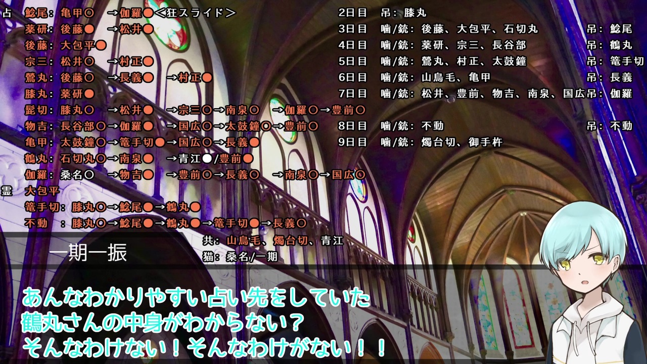 お待たせしました…<br>結果的に4ねね1頭1包平でフィニッシュです。<br><strong>配役:村7/占2/霊2/狩1/共3/猫1/狼8/狂3/狐3</strong><br><br>2日目→<a href="https://www.nicovideo.jp/watch/sm37999868" class="watch">sm37999868</a><br><a href="https://www.nicovideo.jp/watch/sm38101932" class="watch">sm38101932</a>←7+8日目|<a href="https://www.nicovideo.jp/mylist/65368586" target="_blank" rel="noopener">mylist/65368586</a>|<span style="font-size: 16px;">反省会→<a href="https://www.nicovideo.jp/watch/sm38250305" class="watch">sm38250305</a></span><br><br />だてぐみじんろう:<a href="https://www.nicovideo.jp/series/1107" target="_blank" rel="noopener">series/1107</a><br>→考察、感想をTwitterでつぶやくときは<strong>「#だてぐみじんろう」</strong>をどうぞ!私が喜びます。<br>ジョジョ卓:<a href="https://www.nicovideo.jp/series/29049" target="_blank" rel="noopener">series/29049</a><br>ダイマ動画:<a href="https://www.nicovideo.jp/series/29054" target="_blank" rel="noopener">series/29054</a><br>無人島開発:<a href="https://www.nicovideo.jp/series/112224" target="_blank" rel="noopener">series/112224</a><br>解説動画:<a href="https://www.nicovideo.jp/series/179736" target="_blank" rel="noopener">series/179736</a>