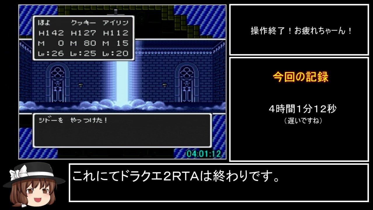※ドラゴンクエストシリーズ作品のガイドラインが変わりました。<br>動画投稿が公式で認められました。よってそのガイドラインに従って投稿します。<br>【利用条件】にエンディング部分の動画投稿はダメ!というものがあります。<br>なのでラスボスを倒した時点で終わるように編集し直しました。<br>ラスト部分以外は前回投稿した動画と同じ内容になっております。<br><br><br>稼ぎ完了 ~ ラスボス撃破 まで<br><br><br><<a href="https://www.nicovideo.jp/watch/sm37230057" class="watch">sm37230057</a>>←part7<br><br><br>【プレイ環境】<br>・スーパーファミコン実機(リセットボタン壊れてる)<br>・純正コントローラー使用<br><br>SFC版ドラクエ2RTA集 <a href="https://www.nicovideo.jp/mylist/68700753" target="_blank" rel="noopener">mylist/68700753</a><br><br><br>この動画で利用している株式会社スクウェア・エニックスを代表とする共同著作者が権利を所有する著作物及びスギヤマ工房有限会社が権利を所有する楽曲の転載・配布は禁止いたします。<br> © 1993 ARMOR PROJECT/BIRD STUDIO/SQUARE ENIX All Rights Reserved.<br> © SUGIYAMA KOBO<br><br><br />RTApart1集 <a href="https://www.nicovideo.jp/mylist/66965194" target="_blank" rel="noopener">mylist/66965194</a><br>通常プレイpart1集 <a href="https://www.nicovideo.jp/mylist/67545233" target="_blank" rel="noopener">mylist/67545233</a><br>単発動画 <a href="https://www.nicovideo.jp/mylist/66997539" target="_blank" rel="noopener">mylist/66997539</a>