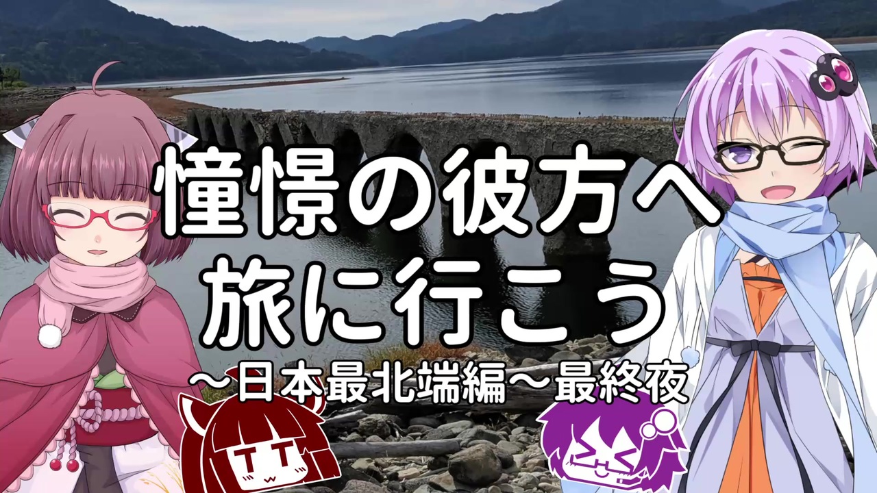 <span style="font-size: 24px;"><strong>あなたの旅。あなたへの詩。あなたのための物語。あなたが私にこんな気持ちをくれたように。</strong></span><br><br><br>スーパーカブと巡る北海道の旅最終日。我々はかの有名なタウシュベツ橋梁を間近で見るべく出発いたしました。時は9月、例年なら大雪山の雪解け水をたくわえる湖に沈む季節、果たして橋に近づくことはできたのか。そして、ゆかりさんの導きに対してきりたんが出した答えとは…。<br><br>2021年最新作、シリーズ日本最北端編、堂々の最終夜です!<br><br><br>マイリスト<a href="https://www.nicovideo.jp/mylist/68225784" target="_blank" rel="noopener">mylist/68225784</a><br>前回(第7夜)<a href="https://www.nicovideo.jp/watch/sm38001450" class="watch">sm38001450</a>|今ココ(最終夜)|次回 (しまなみ山陽編第1夜)<a href="https://www.nicovideo.jp/watch/sm38443715" class="watch">sm38443715</a><br><br><br>エンディングでご紹介しました作品は、コンテンツツリーをチェックすべし。<br><br><br>twitterを始めました。進捗とか旅のこととか社畜的なことつぶやいてます(こっちも超初心者につき多少のミスとかはご勘弁を)<br><a href="https://twitter.com/mino25158128" target="_blank" rel="noopener nofollow">https://twitter.com/mino25158128</a>