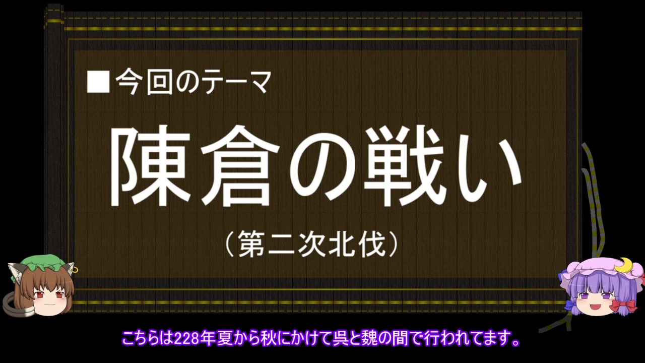 久々の北伐解説は、陳倉の戦い(第二次北伐)です。<br>曹真は蜀軍の動きを予測していたのに、何故陳倉に千人しか配置していなかったんでしょうか。<br><br>解説 :パチュリー<br>曹叡 :橙<br>曹真 :レティ<br>諸葛亮 :映姫<br>趙雲 :マミゾウ<br>郭淮 :ミスティア<br>孫権 :レミリア<br>曹休 :大妖精<br>司馬懿 :永琳<br>張郃 :慧音<br>陸遜 :布都<br>劉禅 :萃香<br><br><br>■前回(北伐 石亭の戦いヤンデレ篇)<br><a href="https://www.nicovideo.jp/watch/sm37442916" class="watch">sm37442916</a><br><br>☆参考サイト<br>■三国志、全文検索<br><a href="http://www.seisaku.bz/sangokushi.html" target="_blank" rel="noopener nofollow">http://www.seisaku.bz/sangokushi.html</a><br><br>■三国志総合情報サイト<br><a href="https://sangokushi.jp/" target="_blank" rel="noopener nofollow">https://sangokushi.jp/</a><br><br>■维基文库(資治通鑑)<br><a href="https://zh.wikisource.org/wiki/%E8%B3%87%E6%B2%BB%E9%80%9A%E9%91%91" target="_blank" rel="noopener nofollow">https://zh.wikisource.org/wiki/%E8%B3%87%E6%B2%BB%E9%80%9A%E9%91%91</a><br><br>■BGM<br>銀の意思 /英雄伝説 空の軌跡SC オリジナルサウンドトラック / Copyright © Nihon Falcom Corporation <br><br>動画作成ツール:ゆっくりムービーメーカー3<br><a href="https://manjubox.net/ymm3/" target="_blank" rel="noopener nofollow">https://manjubox.net/ymm3/</a><br><br>立ち絵:キャラ素材(きつねゆっくり) - Nicotalk &キャラ素材配布所<br><a href="http://www.nicotalk.com/charasozai_kt.html" target="_blank" rel="noopener nofollow">http://www.nicotalk.com/charasozai_kt.html</a><br><br>AquesTalkライセンス購入済み