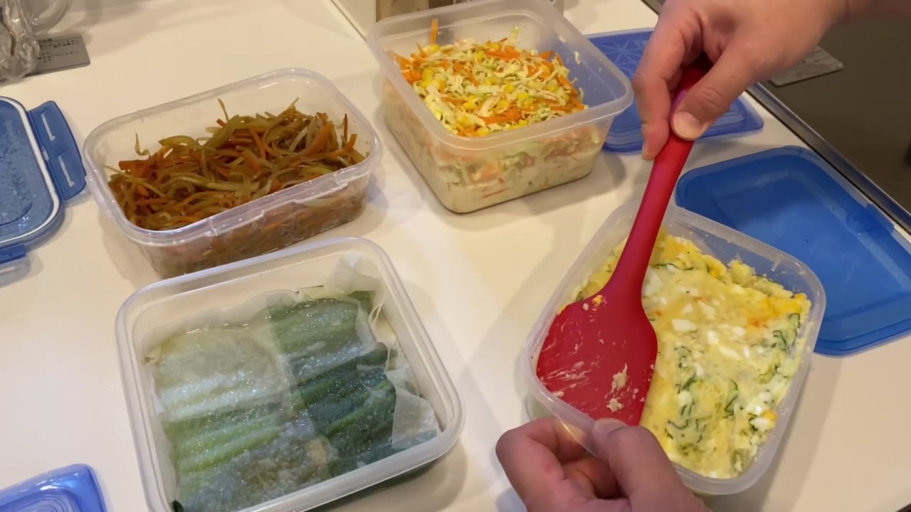 【材料】<br>・ポテトサラダ<br> じゃがいも 3つ<br> きゅうり 1本<br> 玉ねぎ 半分<br> ゆで卵 1つ<br> マヨネーズ 大さじ3 ※1<br> クレイジーソルト 小さじ2 ※1<br> ブラックペッパー 適量 ※1<br> 分量外 塩 適量<br><br>・大根の皮のきんぴら<br> 大根の皮 1本分<br> 人参 1本<br> 日本酒 大さじ2 <br> みりん 大さじ2 <br> 醤油 大さじ1 <br> ごま油 大さじ2 <br><br>・コールスローサラダ<br> キャベツ 1/4個<br> 人参 1本<br> マヨネーズ 大さじ3 ※2<br> 酢 大さじ2 ※2<br> 砂糖 小さじ2 ※2<br> 塩 小さじ1 ※2<br> ブラックペッパー 小さじ1 ※2<br> 分量外 塩水 適量<br><br>・小松菜のおひたし<br> 小松菜 10株<br> 水 1/2カップ ※3<br> 醤油 小さじ1 ※3<br> 白だし 小さじ1 ※3<br> 分量外 塩・水 適量<br><br>【全体手順】<br>1.じゃがいもの表面に切れ込みを入れ、茹でる<br><br>2.玉ねぎ・きゅうりをスライス、その後塩揉みし余分な水分を除く<br><br>3.人参・大根の皮・キャベツを千切りにする<br><br>4.千切りにした人参・キャベツを塩水にさらしておく<br><br>5.茹で終わったじゃがいもの皮をむき、良く水気を切って2.と合わせる<br><br>6.※1を5.に入れ混ぜ、タッパーに入れて粗熱を取る<br><br>7.熱したフライパンンにごま油大さじ1を敷き、千切りにした人参と大根の皮を投入<br><br>8.しんなりしてきたら、日本酒・みりん・醤油の順で指定量入れなじませる<br><br>9.仕上げにフライパンにごま油大さじ1をふりかけ、和えたらタッパーに入れ粗熱を取る<br><br>10.塩水にさらしておいたキャベツと人参の水を切り、水分をよくふき取る<br><br>11.※2と10.をよく混ぜタッパーに入れる<br><br>12.小松菜を根1分・全体1分で塩茹でにし、氷塩水ににつける<br><br>13.よく水気切り等分にした12.と※3をタッパーに入れ、上からキッチンペーパーを被せる<br><br>14.12.の残り汁で卵を茹で、6.と混ぜる<br><br>15.粗熱が取れた状態の各品を冷蔵庫に入れ保存<br><br>※保存期間 各料理 冷蔵:5日 冷凍:気持ち次第