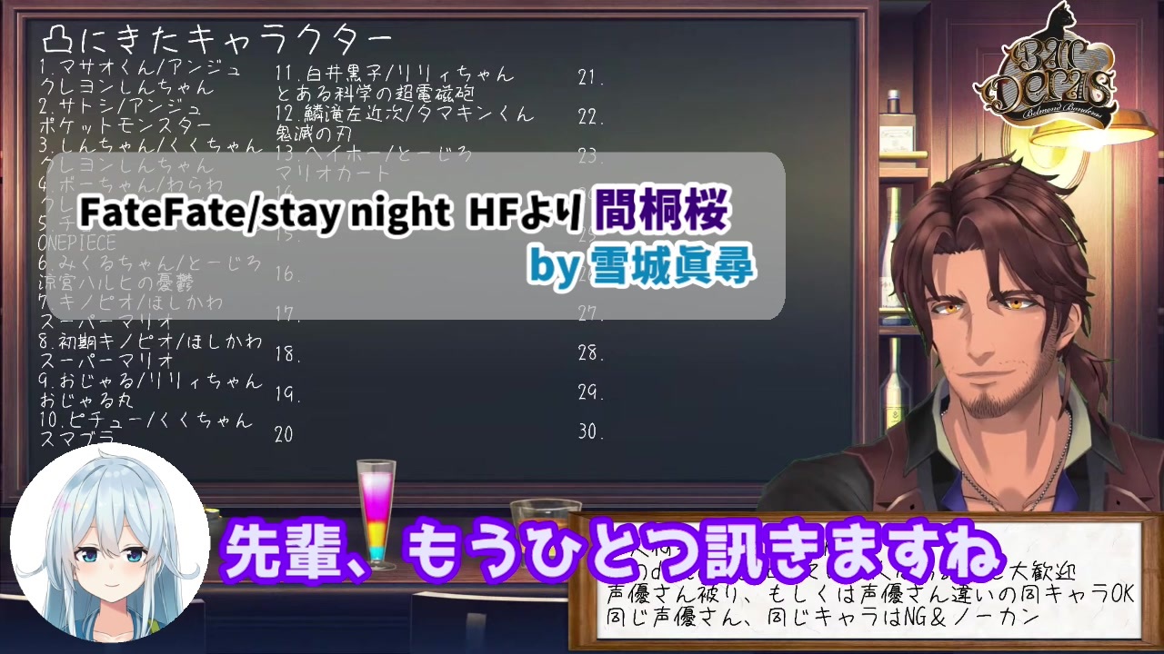 本家台詞はこちらからどうぞ。時間指定URLなのですぐ聴けます。<br>劇場版「Fate/stay night [Heaven's Feel] I.presage flower」Blu-ray&DVD 発売告知PV | 5.9(wed) ON SALE<br><a href="https://youtu.be/jOP-nHfCvIE?t=33" target="_blank" rel="noopener nofollow">https://youtu.be/jOP-nHfCvIE?t=33</a><br><br>そしてベルさん30万人おめでとう。<br><br>【30万人記念】30キャラから声真似凸が来るまで終わらない!お知らせもあるよ!【ベルモンド・バンデラス/にじさんじ】<br><a href="https://youtu.be/0ZfWoK5ria4" target="_blank" rel="noopener nofollow">https://youtu.be/0ZfWoK5ria4</a><br><br>ベルモンド・バンデラス<br><a href="https://www.youtube.com/channel/UCbc8fwhdUNlqi-J99ISYu4A" target="_blank" rel="noopener nofollow">https://www.youtube.com/channel/UCbc8fwhdUNlqi-J99ISYu4A</a><br />雪城眞尋<br><a href="https://www.youtube.com/channel/UCHX7YpFG8rVwhsHCx34xt7w" target="_blank" rel="noopener nofollow">https://www.youtube.com/channel/UCHX7YpFG8rVwhsHCx34xt7w</a><br><br>マイリスト<br><a href="https://www.nicovideo.jp/mylist/65735449" target="_blank" rel="noopener">mylist/65735449</a>