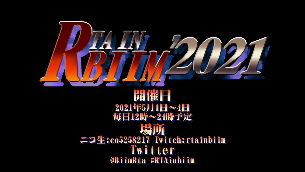 宣伝動画その3<br>RTAinbiim<br>2021年5月1日~4日。<br>毎日12時~24時開催予定。<br><br>◆詳細はこちら◆<br>ホームページ:<a href="https://biimsyabureyo.nagoya" target="_blank" rel="noopener nofollow">https://biimsyabureyo.nagoya</a><br><br>◆運営活動地◆<br>Twitter:<a href="https://twitter.com/BiimRta" target="_blank" rel="noopener nofollow">https://twitter.com/BiimRta</a><br><br>◆会場予定地◆<br>Twitch大会コミュ:<a href="https://www.twitch.tv/rtainbiim" target="_blank" rel="noopener nofollow">https://www.twitch.tv/rtainbiim</a><br>ニコ生大会コミュ:<a href="https://com.nicovideo.jp/community/co5258217" target="_blank" rel="noopener nofollow">https://com.nicovideo.jp/community/co5258217</a><br><br>◆大会主催のお言葉◆<br>ブロマガ:<a href="https://ch.nicovideo.jp/akiyabo/blomaga/ar1983942" target="_blank" rel="noopener nofollow">https://ch.nicovideo.jp/akiyabo/blomaga/ar1983942</a>