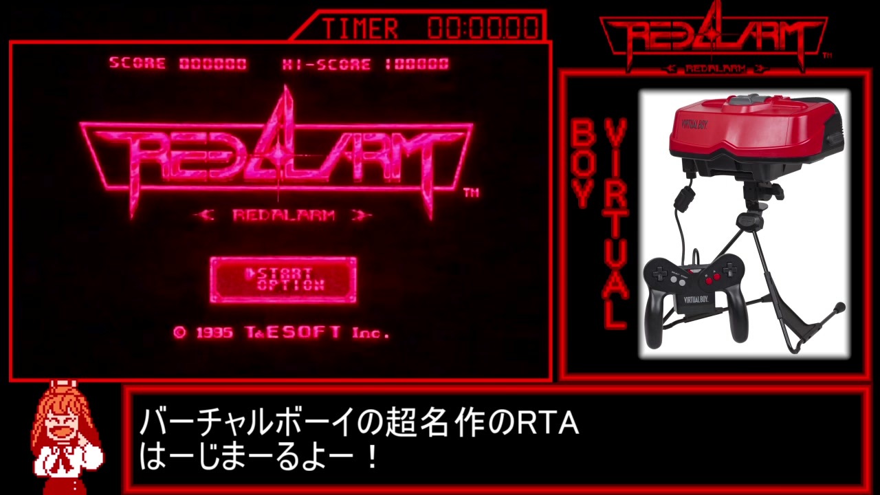 初めての<span style="color: #ff0000;"><strong>バーチャルボーイ</strong></span>RTA解説動画なので初投稿です。<br><span style="color: #ff0000; font-size: 18px;"><strong>赤</strong></span>と<span style="font-size: 18px;"><strong>黒</strong></span>の立体空間にシビれよう!!実機でやると本当に3Dになってて楽しいよ!<br>一応世界記録です(世界一位の海外兄貴と同タイム)<br><br>次作→<a href="https://www.nicovideo.jp/watch/sm38370153" class="watch">sm38370153</a>(田代まさしのプリンセスがいっぱい)<br>前作→<a href="https://www.nicovideo.jp/watch/sm38067038" class="watch">sm38067038</a>(威力棒Viiオリジナルアクションゲーム・プラマー)<br>自作RTA→<a href="https://www.nicovideo.jp/mylist/66567417" target="_blank" rel="noopener">mylist/66567417</a><br>無編集→<a href="https://www.youtube.com/watch?v=l-25DUOC7X0&t=897s" target="_blank" rel="noopener nofollow">https://www.youtube.com/watch?v=l-25DUOC7X0&t=897s</a><br><br>レギュレーション(Speedrun.comのRed Alarm / EASY・any%より)<br>計測開始:タイトル画面でスタートボタンを押した瞬間<br>計測終了:エンディングムービーに入り動かせなくなった瞬間<br>環境:日本製バーチャルボーイ・純正コントローラー・純正電池ボックス・スマホくん<br>※詳細※イージーのみ走者が他にいたためわたしもイージーで走りました。明度と奥行きの指定はなかったため、明度は最大値、奥行きは最低値として走りました。(スマホ越しのため奥行き設定を高めると一部画面が見えなくなる)<br /><br><span style="font-size: 18px;"><strong>↓</strong></span><span style="color: #ff0000; font-size: 18px;"><strong>生放送(毎日20時~24時くらい)</strong></span><br><span style="font-size: 18px;"><strong><a href="https://www.twitch.tv/yuyukichi2" target="_blank" rel="noopener nofollow">https://www.twitch.tv/yuyukichi2</a><br>↓</strong></span><span style="color: #0000ff; font-size: 18px;"><strong>ツイッター</strong></span><br><span style="font-size: 18px;"><strong><a href="https://twitter.com/YuyukichiRTA" target="_blank" rel="noopener nofollow">https://twitter.com/YuyukichiRTA</a><br>↓</strong></span><span style="color: #ff9900; font-size: 18px;"><strong>ホームページ</strong></span><br><span style="font-size: 18px;"><strong><a href="https://yuyukichirta.wixsite.com/yuyukichi" target="_blank" rel="noopener nofollow">https://yuyukichirta.wixsite.com/yuyukichi</a></strong></span>