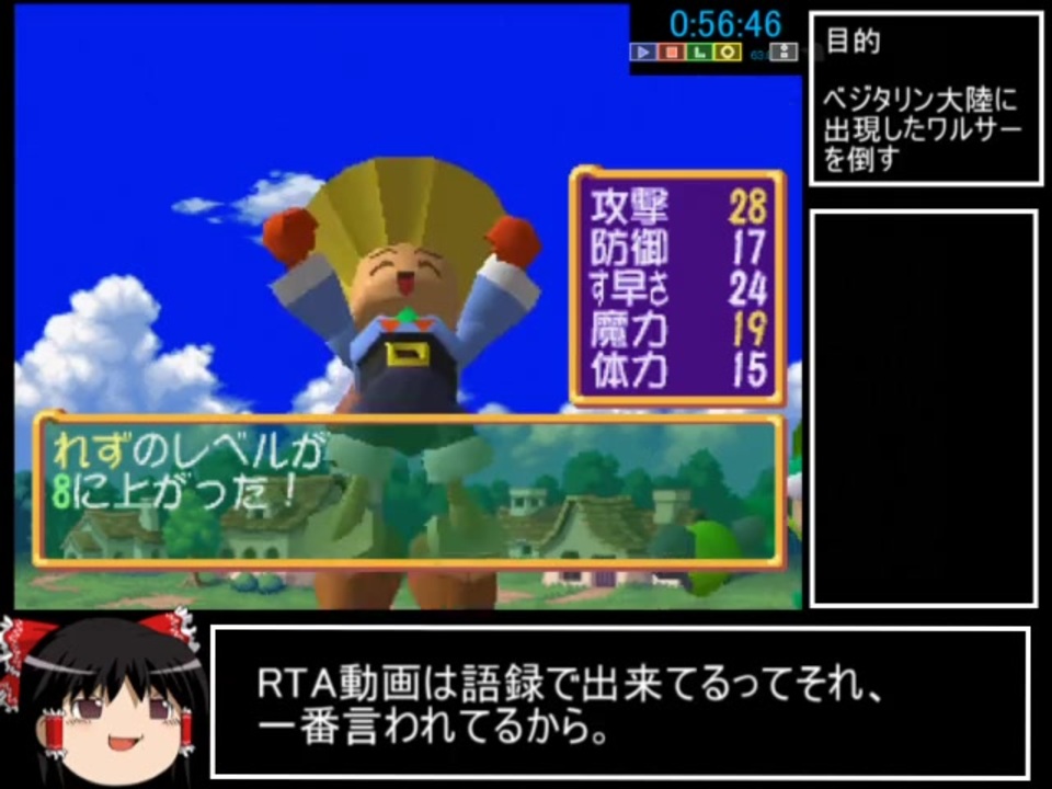 投稿が1か月以上遅れたので、初投稿です。<br><br>次はもうちょっと早く出せるように頑張ります・・・<br>後ミュークルドリーミー面白いからみんな見ろ。<br><br><br>計測区間<br> 開始点:やるぜドカポンを選択した瞬間<br> 終了点:神様を倒した瞬間<br>難易度選択<br> ラク~に冒険<br>使用機材<br> PS3<br><br>Youtube版→<a href="https://youtu.be/NMDgZQNgXRo" target="_blank" rel="noopener nofollow">https://youtu.be/NMDgZQNgXRo</a><br>youtube再生してくれるとモチベ上がるんで、よろしくお願いします!!!<br>(良かったらチャンネル登録もしてね。)<br><br>前:<a href="https://www.nicovideo.jp/watch/sm37972044" class="watch">sm37972044</a><br>次:目標は今月中<br>マイリスト:<a href="https://www.nicovideo.jp/mylist/70195273" target="_blank" rel="noopener">mylist/70195273</a><br><br>更新連絡など→<a href="https://twitter.com/oozorakuroo" target="_blank" rel="noopener nofollow">https://twitter.com/oozorakuroo</a><br><br>part1広告ありがとうございます!今後もがんばるぞい。<br>↓広告してくれた皆さん↓(順不同)<br>CVさん、スコリッピさん、サボてんさん、pongiku さん、ゆっくり饅頭 さん、あでゅーの人 さん、ゴハン さん、春巻 さん、色白腹黒 さん、タビビト さん、やろか君 さん、モンモン さん、イープー さん、ツリモンストラム さん、ゆっくり饅頭 さん、ウイウイ さん、おかず何 さん、なす さん、ふぉるてうす さん、アルビ さん、ジャアクフロスト さん、Tossi さん、T.I. さん、sasahari さん、(*^○^*) さん