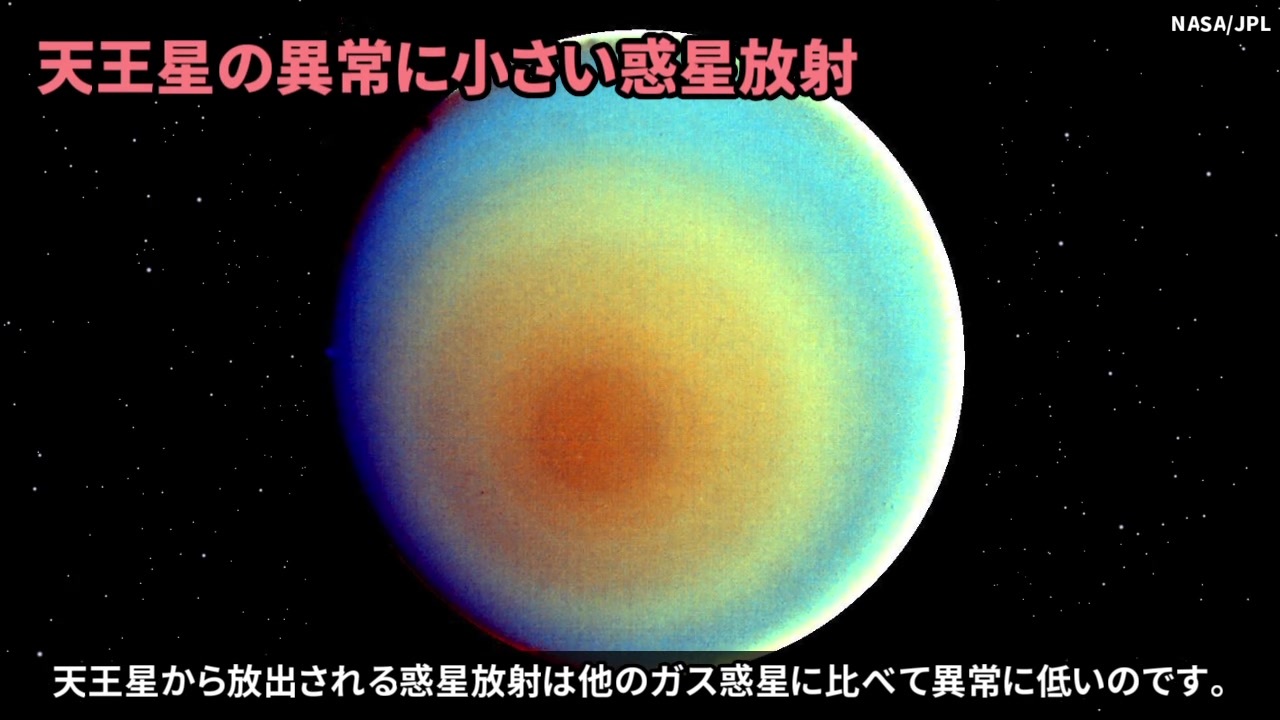 天王星は自転軸が横倒しになっていることが特徴的ですが、惑星から放出される熱エネルギーが、他のガス惑星に比べて異常に低いことが、大きな謎となってきました。この謎を説明するために近年提案されたアイディアを紹介します。<br><br>※本動画はYouTubeで2020/7/28に公開したものです。<br><a href="https://youtu.be/Kx9RvpOE66I" target="_blank" rel="noopener nofollow">https://youtu.be/Kx9RvpOE66I</a><br><br>(目次)<br><a href="#" class="seekTime" data-seekTime="0:00" onclick="seekNicoPlayer('#0:00'); return false;">#0:00</a> 異常に小さい天王星の惑星放射<br><a href="#" class="seekTime" data-seekTime="1:37" onclick="seekNicoPlayer('#1:37'); return false;">#1:37</a> 二つの仮説<br><a href="#" class="seekTime" data-seekTime="2:19" onclick="seekNicoPlayer('#2:19'); return false;">#2:19</a> 内部で熱輸送を遮断?<br><a href="#" class="seekTime" data-seekTime="3:01" onclick="seekNicoPlayer('#3:01'); return false;">#3:01</a> 巨大衝突の影響<br><a href="#" class="seekTime" data-seekTime="4:06" onclick="seekNicoPlayer('#4:06'); return false;">#4:06</a> 待ち望まれる天王星探査ミッション<br><br>(参考文献)<br>Helled, R., Nettelmann, N. & Guillot, T. Uranus and Neptune: Origin, Evolution and Internal Structure. Space Sci Rev 216, 38 (2020).<br><a href="https://doi.org/10.1007/s11214-020-00660-3" target="_blank" rel="noopener nofollow">https://doi.org/10.1007/s11214-020-00660-3</a><br><br>A. Vazan & R. Helled (2020) Explaining the low luminosity of Uranus: a self-consistent thermal and structural evolution. Astronomy & Astrophysics 633, A50.<br><a href="https://doi.org/10.1051/0004-6361/201936588" target="_blank" rel="noopener nofollow">https://doi.org/10.1051/0004-6361/201936588</a><br><br>C. Reinhardt et al. (2019) Bifurcation in the history of Uranus and Neptune: the role of giant impacts. Monthly Notices of the Royal Astronomical Society 492, 4, 5336-5353.<br><a href="https://doi.org/10.1093/mnras/stz3271" target="_blank" rel="noopener nofollow">https://doi.org/10.1093/mnras/stz3271</a><br><br>K. Kurosaki & M. Ikoma (2017) Acceleration of Cooling of Ice Giants by Condensation in Early Atmospheres. The Astronomical Journal 153, 260.<br><a href="https://doi.org/10.3847/1538-3881/aa6faf" target="_blank" rel="noopener nofollow">https://doi.org/10.3847/1538-3881/aa6faf</a><br><br>【画像素材】<br>Space Engine, NASA/JPL-Caltech/GSFC<br><br />ご視聴ありがとうございます。最新作はYouTube/惑星科学チャンネルでご覧ください。<br><a href="https://www.youtube.com/user/muso0" target="_blank" rel="noopener nofollow">https://www.youtube.com/user/muso0</a><br><br>Twitter:<br><a href="https://twitter.com/PlanetScholar" target="_blank" rel="noopener nofollow">https://twitter.com/PlanetScholar</a>