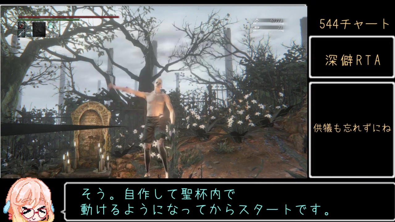 RTAなので初投稿です。<br><br>544で走っている方がいなかったので(いたらごめんなさい)私が世界記録です。<br><br>このRTAの先駆者兄貴 <a href="https://www.nicovideo.jp/watch/sm36682842" class="watch">sm36682842</a><br>追走者で素材元の世界記録兄貴 <a href="https://www.nicovideo.jp/watch/sm37151372" class="watch">sm37151372</a> +使用した素材 <a href="https://www.nicovideo.jp/watch/sm37153763" class="watch">sm37153763</a><br><br> 深僻RTAルール<br>①自作であること(供犠を使用する)<br>②走る直前に作成し、それを用いること<br>③計測開始は聖杯で動けるようになったら<br>④計測終了は最深度ボス撃破後、血晶石の表示がでた時<br>⑤映画レビューをすること<br><br>前の深僻RTA <a href="https://www.nicovideo.jp/watch/sm37669279" class="watch">sm37669279</a><br>検証に協力してくれた狩人様方、資料を提供してくれた狩人様。<br>本当にありがとうございました!!<br><br>検証に協力してくださった古狩人様の動画 <a href="https://www.nicovideo.jp/watch/sm36380718" class="watch">sm36380718</a><br>聖杯ぐらし!は為になる情報が多いので、絶対見た方が良い(断言)<br><br>普段は地底マルチやイベント動画を作っています <a href="https://www.nicovideo.jp/mylist/67778947" target="_blank" rel="noopener">mylist/67778947</a><br><br>連絡用ついた <a href="https://twitter.com/takuan485" target="_blank" rel="noopener nofollow">https://twitter.com/takuan485</a>