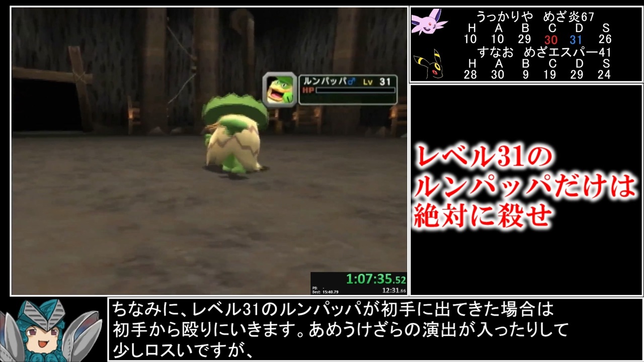 一瞬ブラッキーの良さが光るかもしれない区間<br><br>Q.あたまよいよいAIの判断基準はダメージっていうけどダメージには乱数幅あるじゃん。そこんとこどうなってんねん。<br><br>A.ポケモンのダメージは一定の計算式から算出された値の、100%、99%、98%、……86%、85%の16通りの数字の小数点以下切り捨ての値の中からランダムで決定されます。(これがいわゆるダメージの乱数幅)<br>「ポケモンコロシアムの」あたまよいよいAIの判断基準は、このうち最大ダメージの値のみが用いられるため、基本的にはこちらのHPが最大ダメージ以下の場合その技を打ってきますし、例えばこちらを倒せると判断されて攻撃されたとしても低い乱数を引けば耐えるといったこともあります。(「ポケモンコロシアムの」と書いたのは他のポケモンシリーズのAIとは異なるからです。詳細は省略。とにかくポケモンコロシアムは細かいところで普通のポケモンシリーズとは違う点が非常に多く、パチモンといっても過言ではない。)<br><br>最近Youtubeでbiim動画の悪質なてんのりが行われているので、私も自分の動画をてんのりするようにしました。チャンネル登録して♡<br>Youtube:<a href="https://www.youtube.com/channel/UCFNt4RjMexXiHyG4z5tYJ_Q" target="_blank" rel="noopener nofollow">https://www.youtube.com/channel/UCFNt4RjMexXiHyG4z5tYJ_Q</a><br><br>チャートはまだSRCにある英語のチャートしかないです。ダメージシートもそこにあります。<br>日本語のチャートは僕が書かない限りありません。<br><br>Twitter:@balbalgabaltan<br><br>前:<a href="https://www.nicovideo.jp/watch/sm38215931" class="watch">sm38215931</a><br>次:<a href="https://www.nicovideo.jp/watch/sm45285839" class="watch">sm45285839</a>