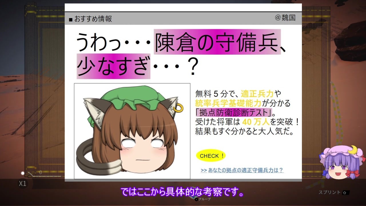 今回は陳倉の戦いにおける曹真の防衛戦略についての考察回です。<br>背景のゲームはこの動画のためだけに購入しました。<br><br>解説 :パチュリー<br>曹叡 :橙<br>曹真 :レティ<br>諸葛亮 :映姫<br><br>■前回(北伐 陳倉の戦い 散関通過篇)<br><a href="https://www.nicovideo.jp/watch/sm38195671" class="watch">sm38195671</a><br><br>☆参考サイト<br>■三国志、全文検索<br><a href="http://www.seisaku.bz/sangokushi.html" target="_blank" rel="noopener nofollow">http://www.seisaku.bz/sangokushi.html</a><br><br>#三国志<br>#歴史<br>#ゆっくり解説<br><br>■BGM<br>銀の意思 /英雄伝説 空の軌跡SC オリジナルサウンドトラック / Copyright © Nihon Falcom Corporation <br><br>■背景のゲーム<br>Ubisoft 「STEEP」<br><br>動画作成ツール:ゆっくりムービーメーカー3<br><a href="https://manjubox.net/ymm3/" target="_blank" rel="noopener nofollow">https://manjubox.net/ymm3/</a><br><br>立ち絵:キャラ素材(きつねゆっくり) - Nicotalk &キャラ素材配布所<br><a href="http://www.nicotalk.com/charasozai_kt.html" target="_blank" rel="noopener nofollow">http://www.nicotalk.com/charasozai_kt.html</a><br><br>AquesTalkライセンス購入済み